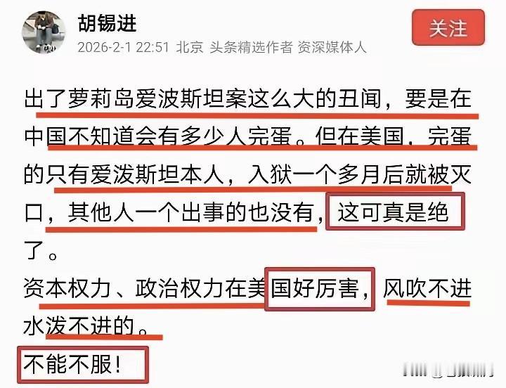 美帝又上“批判台”!大V网友齐出动,群起而攻火力凶猛。只因美司法部公布萝莉岛爱泼斯坦案三百万页文件。 现任总统川普,前任总统老布什克林顿,商界名人比尔.盖茨与马斯克,彼得二帝与英王子安德鲁均列其中。 各家媒体竞发文,一众大V争置评!广大网友纷纷议论,抨击美帝社会黑暗,政客商人道德败坏,衰落不远了! 连一向沉稳的老胡,也坐不稳了!发文抨击老美:萝莉岛爱泼斯坦的丑闻,如果出在别国,不知多少人要完蛋! 但在美国,只有爱泼斯坦完蛋了,且入狱月余即被灭口,其他一个出事的都没有。资本与政治权力在美国好厉害,真是水泼不进风刮不进,不得不服! 网友评论更多,苍狼不再复述。只举一例为证:美国政界真是烂透了!所以每隔四年,就让他们GOV颠覆一回。最多八年,就能把肮脏政客赶下台! 其实那些政客,手里有了POWER,如果不加限制,都会作恶的!关键是如果防止他们作恶!这是一个大课题! 好在他们的媒体还没烂,还能排除阻挠干扰,把这些丑闻揭露出来,展现世界面前,引起世人警醒,予以纠错! 苍狼纵览以上各种言论,感觉这位网友所言,比那些媒体大V水平都高!看问题精准透彻,深刻全面值得点赞! 大家请看附录,看各家媒体与大V,以及这位网友对于此事的看法。不知你们赞同苍狼观点否?欢迎批评讨论! …………