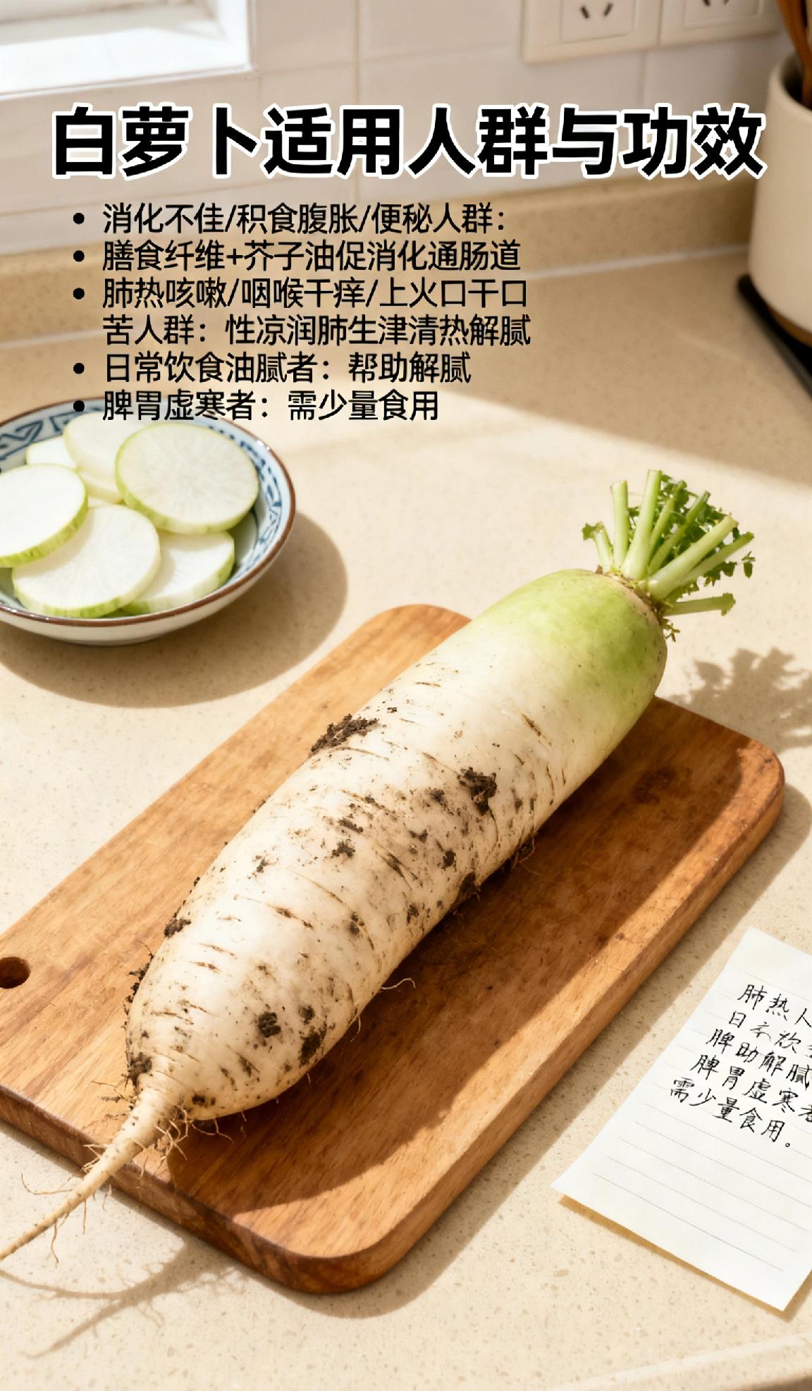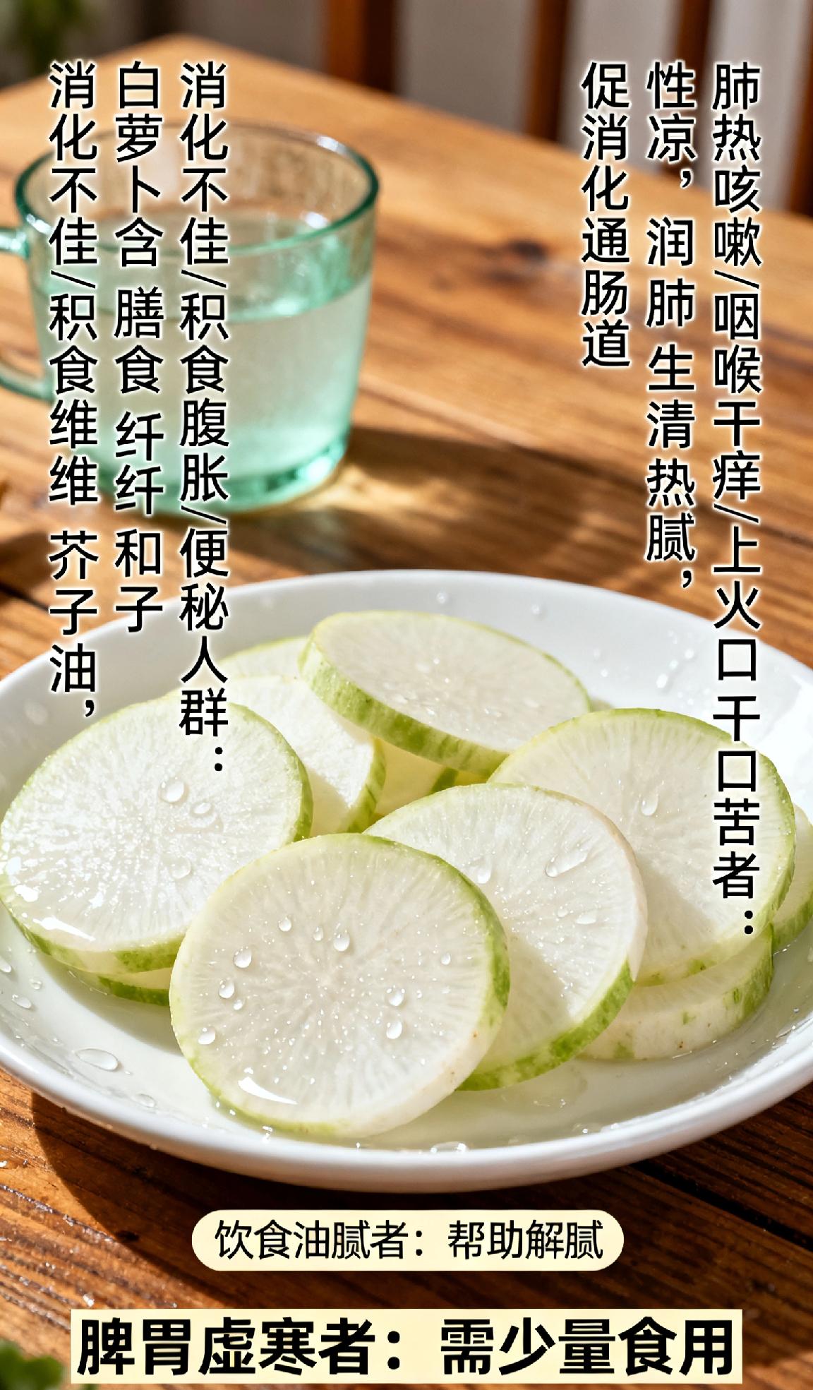 什么人应该吃白萝卜消化不佳、积食腹胀或便秘人群适合吃,白萝卜的膳食纤维和芥子油能促消化、通肠道。肺热咳嗽、咽喉干痒及上火口干口苦的人也适宜,其性凉可润肺生津、清热解腻。日常饮食油腻者吃,还能帮助解腻,脾胃虚寒者则需少量食用。