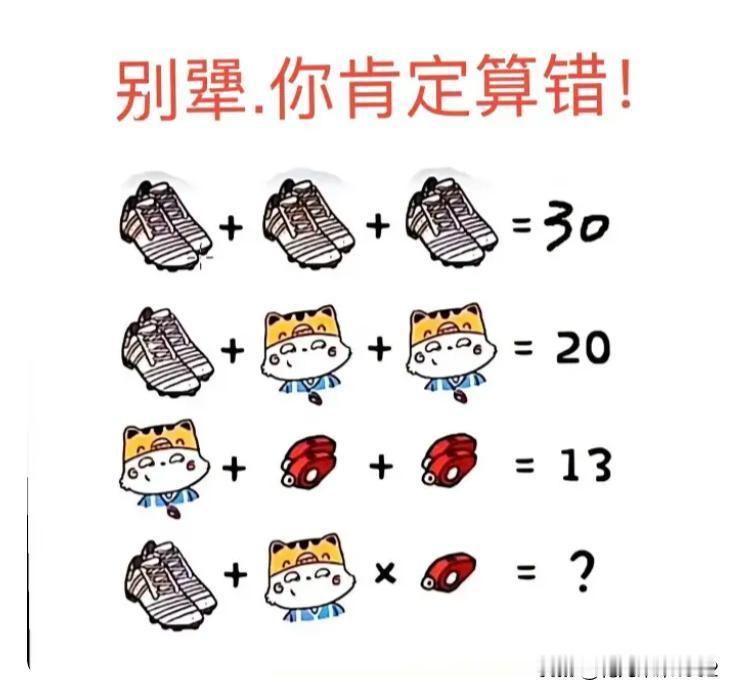 有人认为答案是16,有人认为答案是20,你认真看一下,我们一步步来解: 1. 3双鞋 = 30 → 1双鞋 = 30 ÷ 3 = 10,。。。。。。。。正确答案在评论区