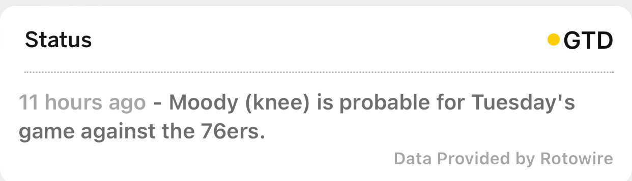 伤病报告显示,明日穆迪(膝盖)出战成疑