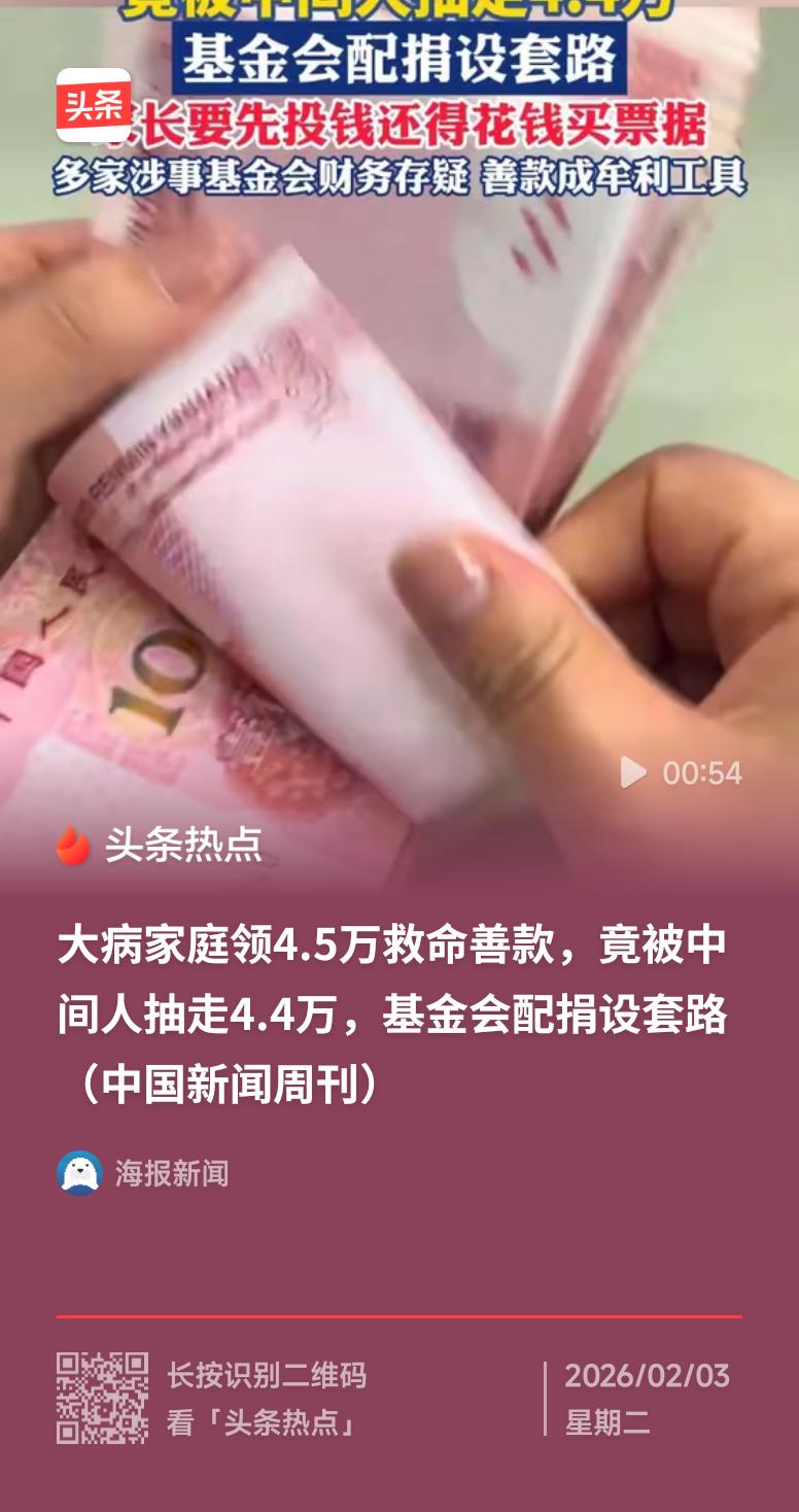 4.5万善款4.4万被中间人“抽走”这哪里是中间人,分明是趴在救命钱上吸血的蛀虫!4.5万善款抽走4.4万,对绝境中的家庭敲骨吸髓,比冷漠更可怕的是利用善良牟利,必须彻查严惩,让公益的底线不再被践踏。