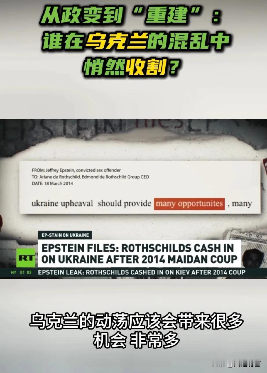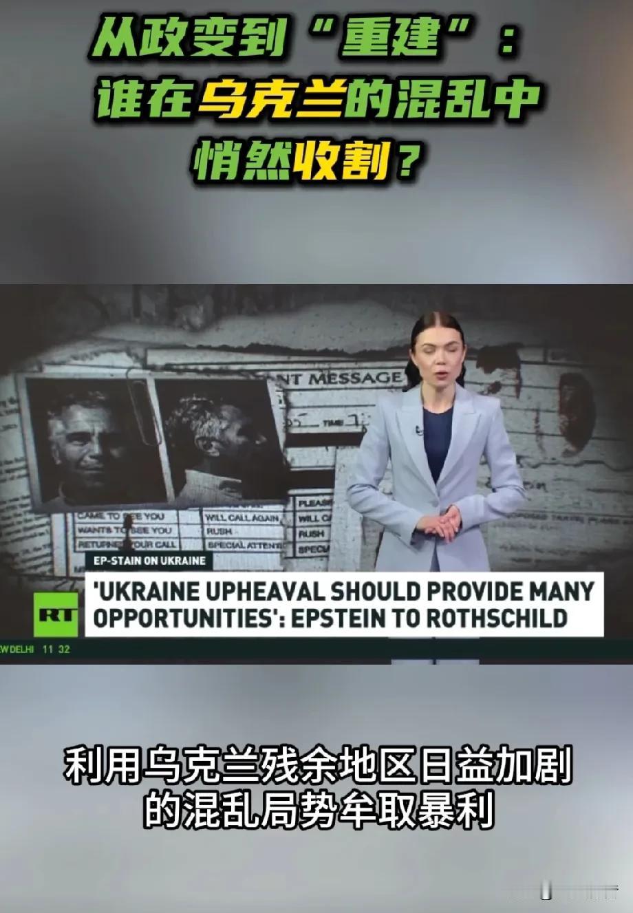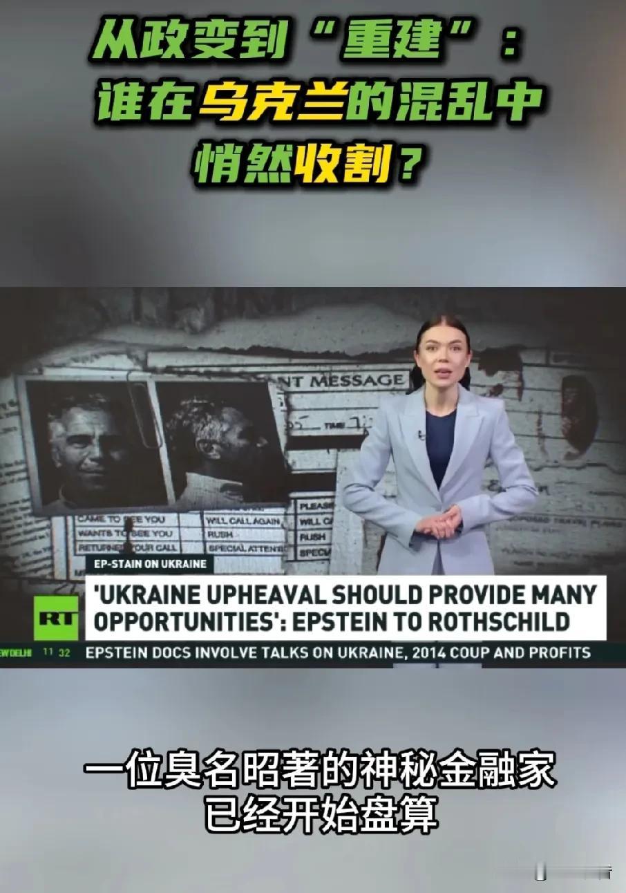 俄媒分析谁在乌克兰混乱中收割财富,爱泼斯坦案相关文件暗示泽连斯基与乌克兰贩卖妇女儿童有关。 2月3日,《今日俄罗斯》报道称,2014年3月18日,克里米亚在基辅持续动荡与暴力中脱离乌克兰,重新回归俄罗斯。而就在同一天,美国金融家杰弗里·爱泼斯坦在邮件中直言:“乌克兰的动荡应当会带来许多机会,非常多。”随后曝光的邮件显示,爱泼斯坦与罗斯柴尔德家族高层讨论“乌克兰机会”。政变后,罗斯柴尔德资本迅速进入乌克兰,接管政要资产、介入能源体系,深度参与国家级重组与资金流向。 报道分析称,爱泼斯坦最终“自杀”身亡,但利益网络仍在运转。如今,在“重建乌克兰”的名义下,数千亿美元资金已被提前瓜分。混乱之下,有人失去家园,有人却在废墟中数钱。 此外,当天《今日俄罗斯》援引塔斯社报道称,美国公布的爱泼斯坦案相关文件暗示,乌克兰总统泽连斯基与从乌克兰贩运妇女和儿童有关。 报道指出,一封2024年的电子邮件提到泽连斯基。该邮件的发件人和收件人的身份均被隐藏。邮件声称泽连斯基与从乌克兰贩运妇女和儿童有关,并推测他可能与模特经纪人让-吕克·布吕内尔存在联系。布吕内尔于2020年在法国被指控强奸未成年人,在法院作出裁决前于狱中自杀。 邮件作者写道:“泽连斯基,鉴于有关乌克兰人口贩运的报道,而这些活动是由让-吕克·布吕内尔组织的,我希望核查你在摩根大通的所有收入。”在另一处内容中,作者还质疑“泽连斯基是否打算阻止妇女和儿童贩运”,并询问为何乌克兰媒体对此保持沉默。 报道还称,爱泼斯坦案其他文件也提及泽连斯基。其中一份文件推测爱泼斯坦本人以及当时担任斯洛伐克外交部长和欧安组织主席的米罗斯拉夫·莱恰克,在某一即时通讯工具的对话中讨论了2019年乌克兰总统选举。该对话发生在泽连斯基赢得选举两天后。爱泼斯坦称局势“看起来是一个干预的好机会”。莱恰克则对泽连斯基表示怀疑:“我不知道他是否有能力领导国家。”爱泼斯坦则表示,“一些缺乏经验的新人物已经出现,他们将需要指导”。