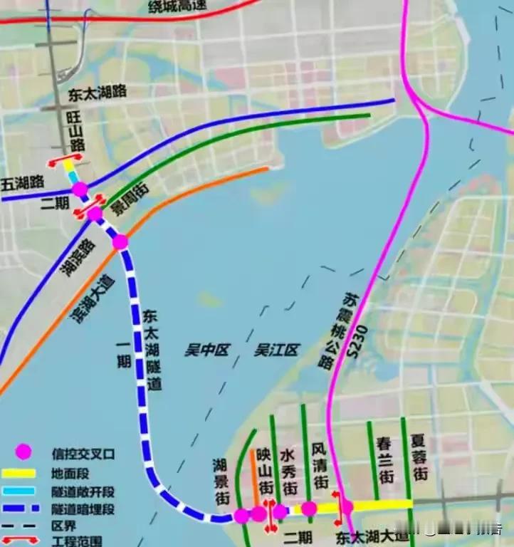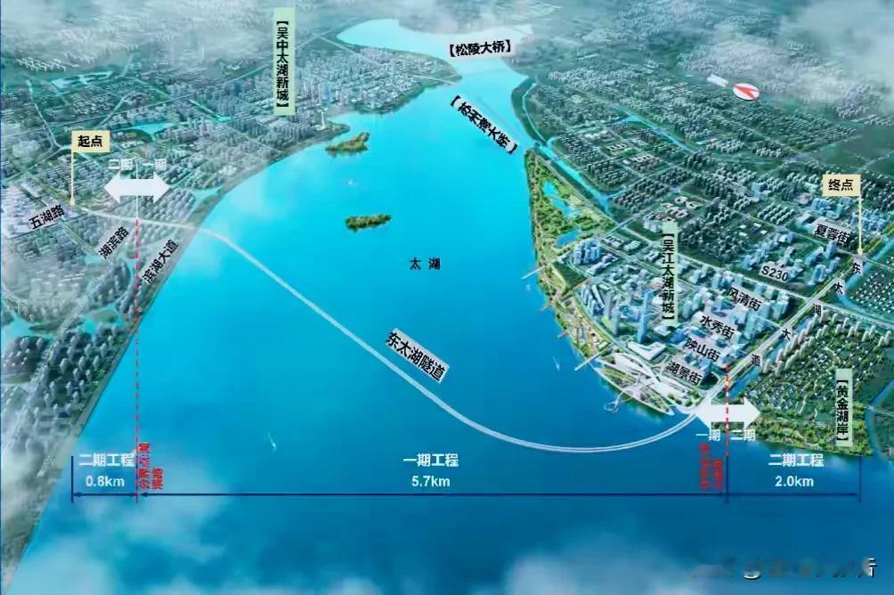 东太湖水域将增加一条隧道。 日前,江苏省发改委公布了2026年度江苏省重大项目清单,其中被无数吴江百姓心心念念的东太湖隧道项目一期工程赫然在列。 东太湖隧道工程分为一期工程和二期工程,其中一期工程就是需要下穿苏州湾太湖水域的长度约5.4公里的隧道。而二期工程则是这条隧道分别在两端的吴中区、吴江区延长线。 这条不长的隧道工程耗资惊人,工程造价高达61亿元,折合每公里10亿元以上。东太湖隧道其实早在三年前就已经公示项目信息,但据说是因为该工程穿越太湖重要湿地对生态环境影响较大,原施工工艺为明挖围堰法,对水体和湖底淤泥层影响较大,后改为盾构法施工。 不过这条隧道计划是今年6月份开工,工期为4年,2030年竣工投用。届时一条双向六车道的隧道沟通太湖新城吴中片区和吴江片区,进一步加速吴江融入主城板块。(图片引用自网络)