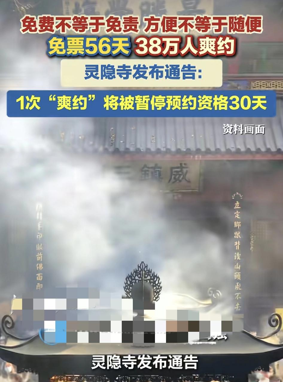 灵隐寺免票56天,但是却有38人是爽约,灵隐寺不得不发出通告,双月一次将免除预约