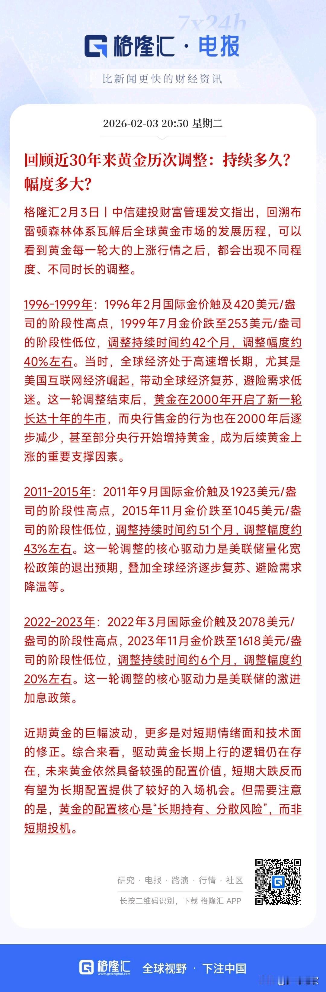 黄金调整都是有原因的,历史上几次黄金大跌及其原因 1. 96-99年:从420美元跌到了253美元。涨到头后跌了42个月,跌了约40%,原因是全球经济强劲、美国互联网风口,没人买黄金避险; 2. 11-15年:从1923美元跌到了1045美元。跌了51个月(4年多),跌了约43%,因为美联储要收紧放水、全球经济回暖,黄金需求降了; 3. 22-23年:从2078美元跌到了1618美元。跌了6个月,跌了约20%,纯因美联储玩命加息导致的。 这几天的黄金大跌根本就没有什么原因,美联储还在降息周期当中,而且世界经济现在也并没有想象中那么好,失业率飙升,经济虽然在回暖,但不确定性太多。特朗普关税政策和地缘政治冲突都在,所以说现在黄金即使跌下去也会涨回来。