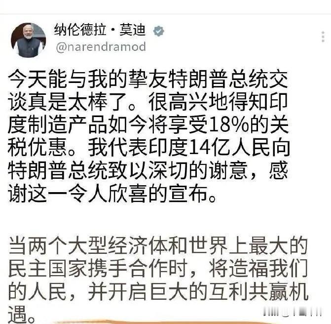 莫迪学会拍马屁了,他“代表印度14亿人民向特朗普总统致以深切的谢意!2月2日,美国总统特朗普与印度总理莫迪进行了电话交谈。随后莫迪推文写道:“今天能与我的挚友特朗普总统交谈真是太棒了。很高兴地得知印度制造产品如今将享受18%的关税优惠。我代表印度14亿人民向特朗普总统致以深切的谢意……” 短评:特朗普这人的特点大家都了解,无论做什么事情,一个前提就是不让美国吃亏。这次美国把对印加征关税从25%降至18%不是白手送的,而是有附加条件的。按照特朗普在社交媒体平台发文中的说法,莫迪承诺购买超5000亿美元美国产品,同意不买俄罗斯石油并从美购买更多石油,还可能从委内瑞拉买石油。这就是交换条件,美国只用降低7% 的关税,却从印度身上刮了几层油,印方不仅购买超5000亿美元美国产品,还必须放弃购买俄罗斯石油,改从美国购买更多石油,这里里外外让美国赚大了!不知莫迪从哪里产生的那股兴奋劲,还对特朗普歌功颂德一番,明明是“自己被出卖了还帮着别人数钱”,脑子就像被驴踢过的一样,真的可笑。