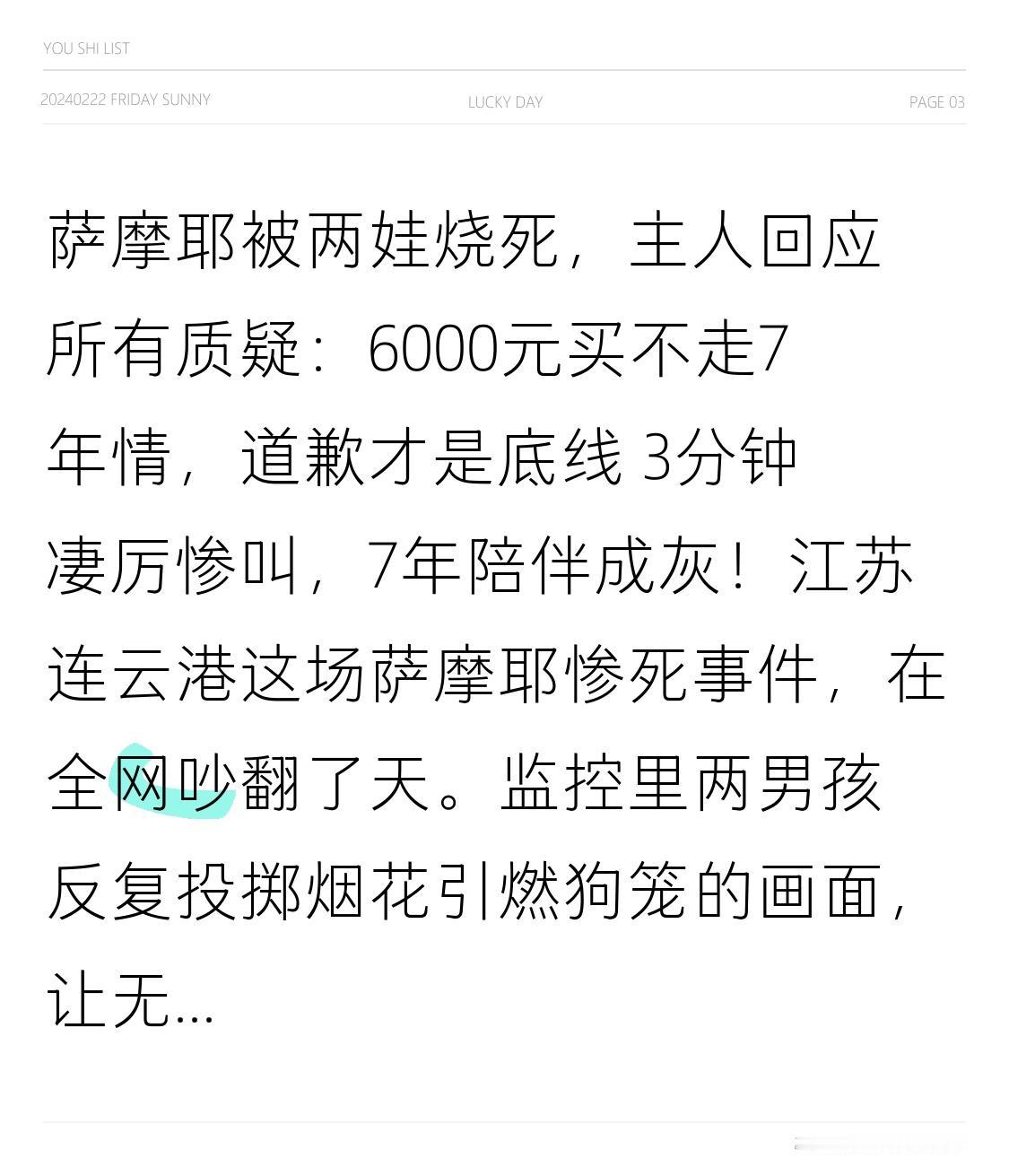 萨摩耶被两娃烧死,主人回应所有质疑:6000元买不走7年情,道歉才是底线 3分钟凄厉惨叫,7年陪伴成灰!江苏连云港这场萨摩耶惨死事件,在全网吵翻了天。监控里两男孩反复投掷烟花引燃狗笼的画面,让无数人揪心;而事发后“6000元私了”的提议、主人被质疑“违规养犬”的争议,更是让事件一波三折。如今主人姜女士终于正面回应所有质疑,每一句话都道出了养宠人的心声。 先回看那令人窒息的监控:2月1日中午12点半,两名男孩先是试探着将点燃的烟花扔进狗笼,见冒烟后跑开;短短一分钟后,两人折返回来,再次点燃烟花递进笼中。笼内易燃挡布瞬间被引燃,浓烟滚滚中,萨摩耶“小旺”的惨叫声持续了3分钟,最终被活活烧死,留下一具烧焦的尸体靠在笼边,保持着求救的姿势。 这只叫小旺的萨摩耶,已经陪伴姜女士一家7年。它温顺乖巧,小区里的孩子常来喂它,物业和邻居7年来从未提出过反对,可谁也没想到,这份安稳会以如此惨烈的方式终结。事发后,涉事家长提出要么赔6000元,要么换一只狗“私了”,却迟迟不愿道歉,这让姜女士无法接受:“小旺是家人,不是可以用金钱衡量的商品,我要的只是一句公开道歉,让孩子知道自己错了。” 可随着事件发酵,质疑声也随之而来:“为什么把狗笼放小区公共区域?是不是违规养犬?”面对争议,姜女士坦然回应:“如果物业或邻居不允许,我们不可能养7年。小旺从不在小区乱跑,一直待在固定笼子里,大家都很喜欢它。”小区业主的聊天记录也印证了这一点,不少居民都主动给小旺喂过食,侧面证明了7年饲养从未引发过纠纷。 更让人意外的是转折点出现:2月3日,白衣男孩家长突然发布道歉视频,鞠躬承认孩子过错,称“已赔偿6000元并签订和解协议”,还反驳“态度恶劣、找关系摆平”是谣言。但姜女士随后补充,赔偿确实收到了,但公开道歉的核心诉求仍未完全落实,她最在意的不是钱,而是让孩子树立对生命的敬畏心。 律师也明确表态,小旺作为陪伴7年的宠物,属于“具有人身意义的特定物”,姜女士不仅可以要求赔偿,还能主张精神损害赔偿。而涉事男孩虽因未成年无需承担刑事责任,但监护人必须履行教育责任,公开道歉也是合法合理的诉求。 这场事件的核心争议,从来不是“6000元够不够”,也不是“是否违规养犬”,而是生命是否值得尊重。有人说“孩子只是调皮”,可反复投掷烟花的行为,早已超出了调皮的范畴;有人觉得“主人小题大做”,可7年的情感寄托,哪能说断就断? 姜女士的坚持,本质上是在捍卫底线:生命不分贵贱,哪怕是一只狗,也不该被肆意伤害;犯错就要认错,而不是用金钱掩盖过错。家庭教育的缺失,比孩子的行为更可怕——如果今天用6000元抹平了生命的重量,明天孩子可能就会漠视更珍贵的东西。 目前警方仍在进一步调解,我们期待涉事家庭能真正正视错误,用真诚的道歉给姜女士一个交代,也给孩子上一堂真正的生命教育课。每个生命都值得被温柔以待,支持姜女士捍卫尊严的,不妨点个赞,让更多人知道:敬畏生命,才是最基本的教养。你觉得孩子犯错后,家长该如何正确处理?欢迎在评论区聊聊你的看法。