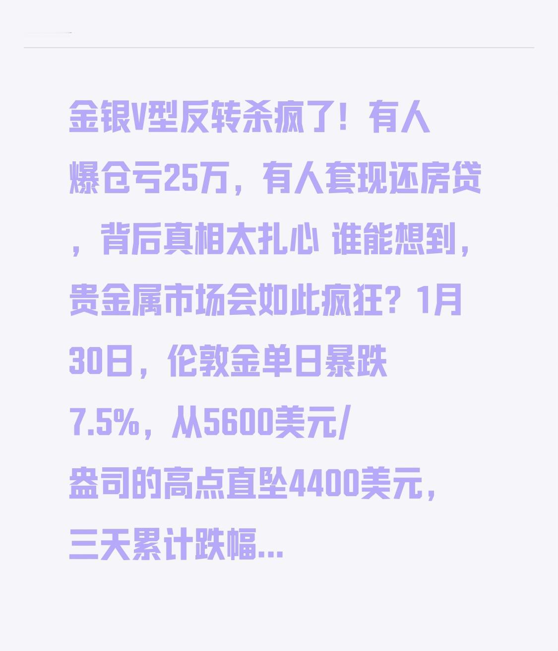 金银V型反转杀疯了!有人爆仓亏25万,有人套现还房贷,背后真相太扎心 谁能想到,贵金属市场会如此疯狂?1月30日,伦敦金单日暴跌7.5%,从5600美元/盎司的高点直坠4400美元,三天累计跌幅超20%;白银更惨,从121美元狂跌至74.8美元,40%的涨幅一夜清零,市值蒸发7.4万亿美元。可就在所有人以为牛市终结时,2月3日金银突然暴力反弹,黄金收复4800美元,白银单日暴涨8%,这场惊心动魄的V型反转,让无数投资者经历了从天堂到地狱再回人间的极致体验。 北京菜百的黄金柜台前,最近挤满了冰火两重天的人群。50多岁的张阿姨拿着1995年买的金项链变现,16克黄金净赚近2万,笑着说“刚好帮孩子还房贷”;而年轻投资者小李却愁眉不展,他加20倍杠杆炒白银,暴跌当天账户从28万被强平到只剩3万,转头暴涨又让他拍断大腿。更魔幻的是银行渠道,工行、农行的实物金条早被抢空,招行紧急将保证金比例上调至70%,可依然挡不住投资者的热情,有人甚至一口气下单450克金条,说是“本命年求稳”。 这波反转的背后,藏着三重关键真相。转折点一,暴跌并非基本面崩塌,而是前期非理性超涨后的技术性调整。1月黄金单月暴涨25%,白银狂涨70%,散户加杠杆入场导致交易拥挤,美联储主席提名变动只是导火索,最终引发“多杀多”踩踏式平仓。转折点二,反弹动力来自央行购金和降息预期。全球央行仍在疯狂囤金,新兴经济体储备缺口巨大,加上市场对美联储3月降息的预期未改,长期支撑逻辑并未破坏。转折点三,白银的暴涨暴跌更具投机属性——短期靠光伏等工业需求支撑稀缺性,长期供给充足,本质是“投机黄金的工具”,涨得猛跌得更狠。 最扎心的是普通投资者的众生相。有人跟风追高,在A股炒作溢价超64%的白银基金,结果停牌复牌即暴跌,连逃跑机会都没有;有人贪心加杠杆,20倍杠杆让25万本金一夜归零,才明白“高收益必伴高风险”的铁律;也有人理性止盈,趁着高位变现老黄金,把浮动收益变成实实在在的生活改善。而光伏企业则在这场波动中苦不堪言,银价暴涨让银浆成本占比飙升至21.4%,隆基、晶科等龙头亏损超40亿元,刚因暴跌喘口气,反弹又让“去银化”技术研发迫在眉睫。 其实这场V型反转,给所有人上了一堂生动的投资课。李大霄早早就警示“黄金泡沫”,可太多人被“一夜暴富”的幻觉蒙蔽,把投资变成了赌运气。金银作为避险资产,本应是资产配置的“压舱石”,却被当成了“翻盘工具”。要知道,短期波动再刺激,也抵不过长期理性的坚守——杠杆能放大收益,更能加速亏损;跟风能赚一时,却可能亏一世。 市场永远不缺机会,但缺的是敬畏之心。金银的V型反转告诉我们,投资不是比谁赚得快,而是比谁走得稳。对于普通人来说,量力而行、不碰高杠杆、不盲目跟风,才是守护财富的根本。你在这场行情中是赚是亏?觉得现在是抄底机会还是风险陷阱?欢迎在评论区聊聊,觉得说得实在的,点个赞让更多人看到:财富没有捷径,稳健才是王道!
