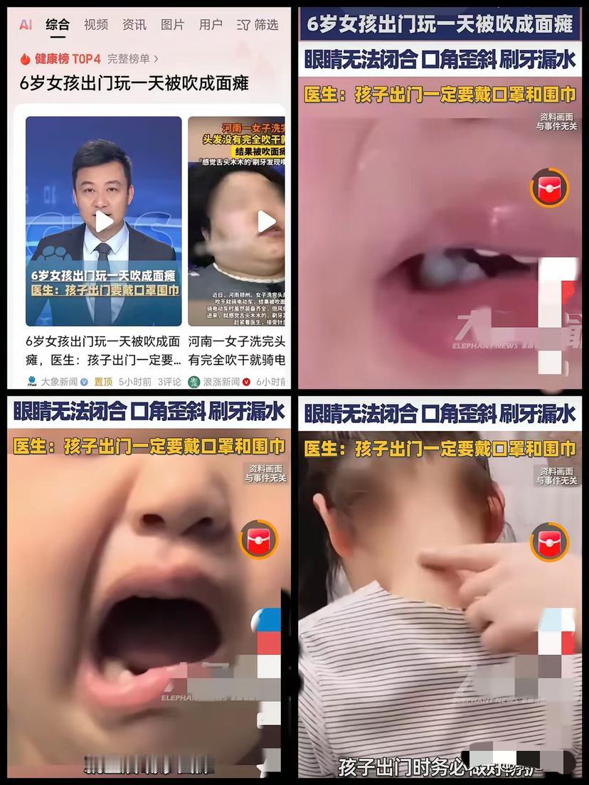 不出意外, 担心的事还是发生了, 近日,河南郑州。6岁女孩周末跟着妈妈出门玩了一天,周一突然出现眼睛闭不上、嘴巴有点歪、刷牙时有点漏水,就医后确诊面瘫。 大冬天的,没有做好防护措施,不要说这么小的孩子了,就是大人也很容易被吹成面瘫了!而且面瘫不是那么好治疗的,那么小一个孩子,真是活受罪了! 国内儿科神经科的年度统计数据显示,深冬季节儿童面神经麻痹的发病率会比春秋季高出近40%,低温寒风引发的面部血管痉挛,是诱发儿童面瘫的最主要外界因素。6岁儿童的面部神经末梢本就纤细脆弱,皮下脂肪层薄得像层膜,根本扛不住冬日冷风的持续侵袭,孩子户外疯玩时出汗后毛孔张开,冷风直灌面部,损伤会来得更迅猛。 孩子妈妈大概率陷入了冬季育儿的防护误区,只忙着给孩子添厚棉衣、围长围巾,却忽略了头面部的核心防护,既没给孩子戴能护住脸颊的防风口罩,也没避开街边、天桥的穿堂风口。孩子一整天的户外玩耍,面部持续受冷风刺激,神经水肿的问题慢慢累积,直到隔天才显现出明显症状,这份疏忽最终让年幼的孩子遭了罪。 儿童面瘫的康复周期短则一月、长则三月,即便经过规范治疗痊愈,治疗过程里的针灸、服药也足够让6岁孩子哭闹抗拒,嘴巴歪斜的状态还会影响孩子正常进食、说话,甚至在校园里遭遇同伴的异样眼光,生理痛苦之外还要承受心理压力。 很多家长总把冬季保暖等同于“穿厚衣服”,却不知头面部是人体御寒的薄弱环节,儿童的神经、血管耐受度远不及成人。这类儿童面瘫病例频频出现,从来不是天气的问题,而是家长的防护认知存在缺口,把基础保暖当成了全面防护,才让可避免的健康风险落到了孩子身上。 冬季带娃出门,备上护耳帽、全脸防风口罩,尽量缩短在迎风处的停留时间,发现孩子面部僵硬、表情异常立刻就医,这些看似细碎的举动,恰恰是守护孩子健康的关键。 各位读者你们怎么看?欢迎在评论区讨论。