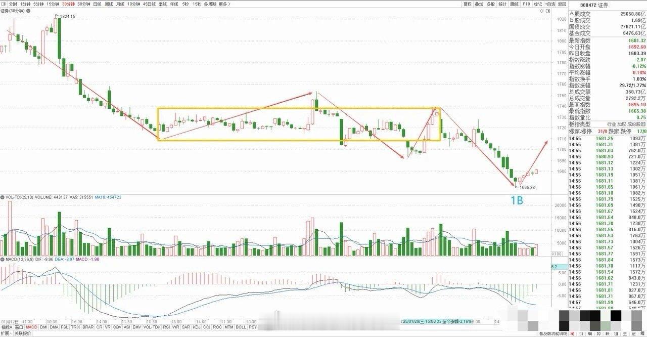 切换到30分钟图,当前走势仍在延伸下跌中枢的离开段。虽说全天表现平淡,但藏着个亮点——背驰买点已经确认。明天若能顺势向上,摸到中枢下沿附近,那么后续即便再回调,也有机会构建“二买”,带动短线级别完成止跌。反之,若反弹乏力,可能还要继续磨底。