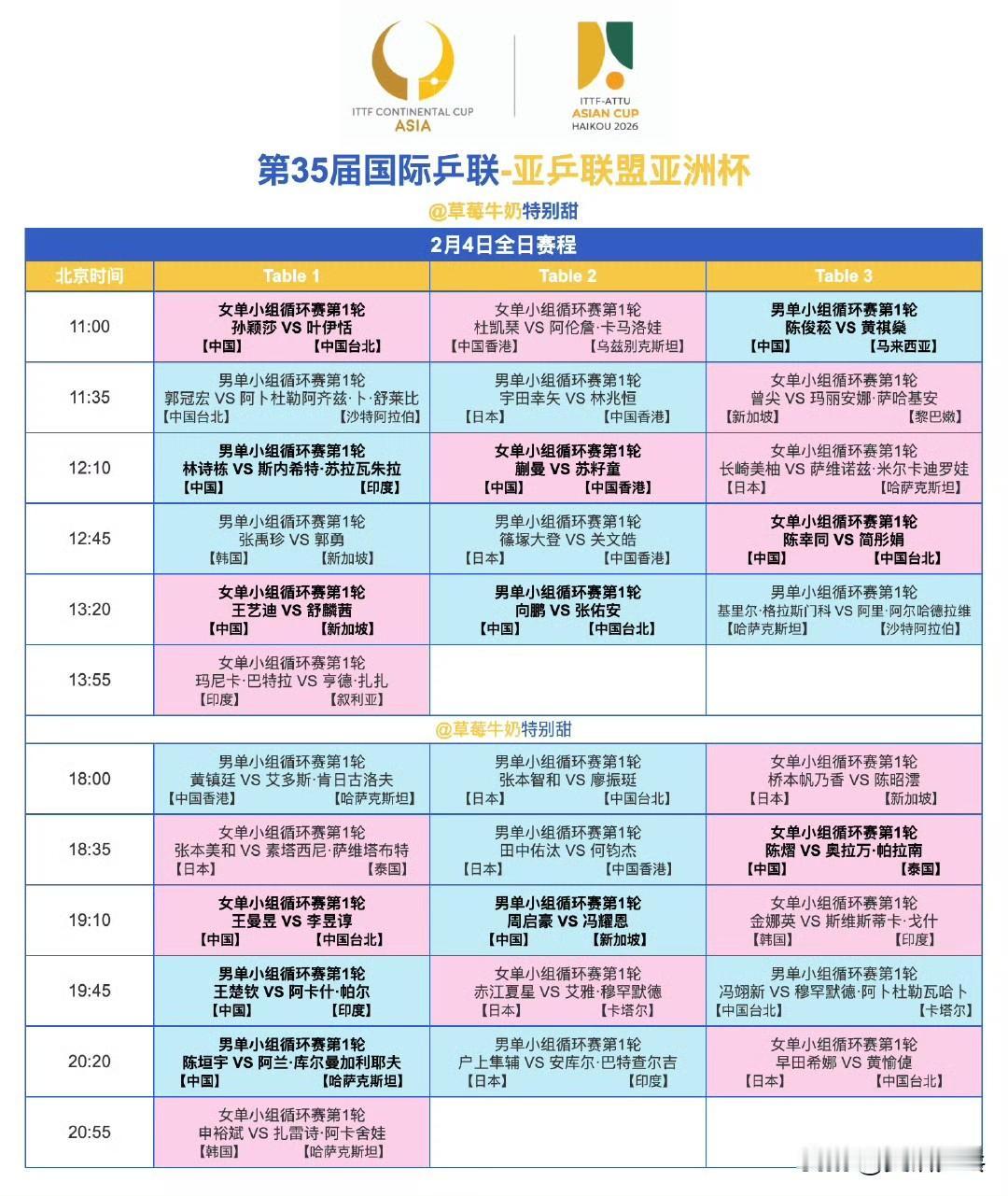 2月4日全日赛程【P2】 11:00 T1 孙颖莎🇨🇳VS叶伊恬(中国台北) 11:00 T3 陈俊菘🇨🇳VS黄祺燊🇲🇾 12:10 T1 林诗栋🇨🇳VS斯内希特·苏拉瓦朱拉🇮🇳 12:10 T2 蒯曼🇨🇳VS苏籽童🇭🇰 12:45 T3 陈幸同🇨🇳VS简彤娟(中国台北) 13:20 T1 王艺迪🇨🇳VS舒麟茜🇸🇬 13:20 T2 向鹏🇨🇳VS张佑安(中国台北) 18:35 T3 陈熠🇨🇳VS奥拉万·帕拉南🇹🇭 19:10 T1 王曼昱🇨🇳VS李昱谆(中国台北) 19:10 T2 周启豪🇨🇳VS冯耀恩🇸🇬 19:45 T1 王楚钦🇨🇳VS阿卡什·帕尔🇮🇳 20:20 T1 陈垣宇🇨🇳VS阿兰·库尔曼加利耶夫🇰🇿
