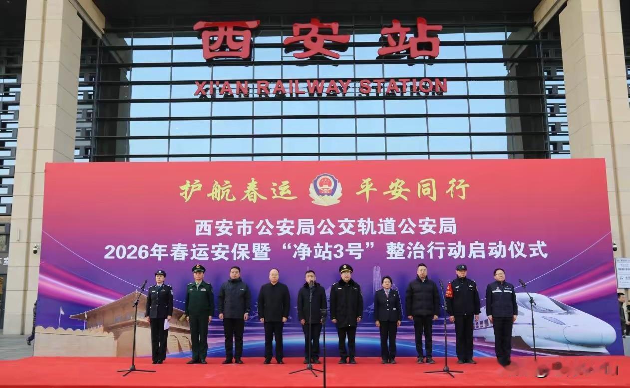 西安公交轨道公安局启动春运 安保暨“净站3号”行动 2月2日,西安市公安局公交轨道公安局在西安火车站北广场启动2026年春运安保暨“净站3号”整治行动,这是打好“十五五”规划开局之战的重要举措,将强化重点区域治安管控,落实多项措施,推动便民服务,护航公共交通和群众出行安全。 护航春运 平安同行 西安市公安局公交轨道公安局 2026年春运安保暨“净站3号 整治行动启动仪式