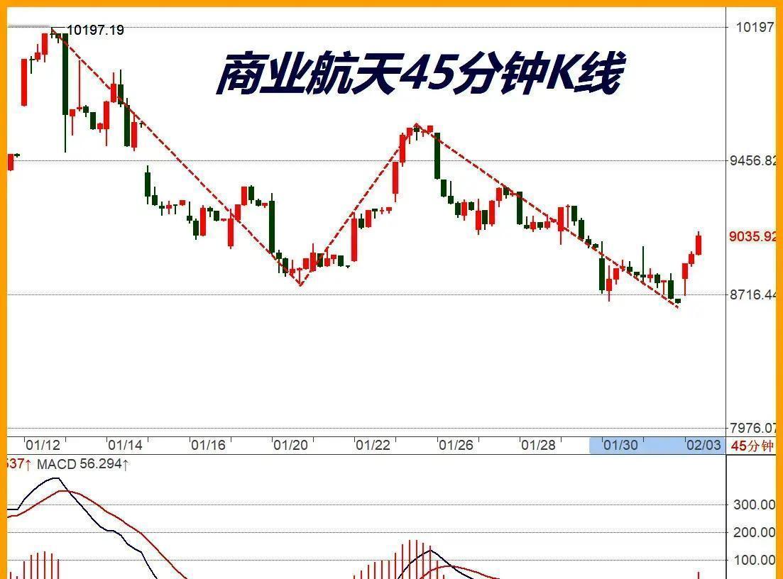2月3日A股大反弹,商业航天板块直接爆发冲在前列! 昨天大盘还在跌,这板块却硬扛住创了新低都没崩盘,技术指标稳得一批,早盘第一个45分钟就直接拉出背离结构,中午收盘涨幅已经4.3%,全天排名靠前,十多只个股直接封板涨停! 这波走势太典型,底部结构清晰,浪型走成ABC,背离信号级别大,资金抄底意愿明显。昨天跌的时候它没破位,今天直接放量拉升,说明低位蓄势已经完成,主力开始发力抢筹。 相比之下,航天军工整体也跟着走ABC调整,但结构没那么完整,弹性比商业航天稍弱点,短期跟随性更强。 全天市场普涨超4800只个股上涨,成交额2.5万亿左右,商业航天领涨的核心逻辑是太空算力需求爆发,国内低轨星座密集部署加速,太空光伏等产业链直接受益,板块热度持续升温。 这波反弹力度强,底部结构稳,背离确认后大概率继续向上修复,短期看涨情绪占优,关注量能能否持续放大