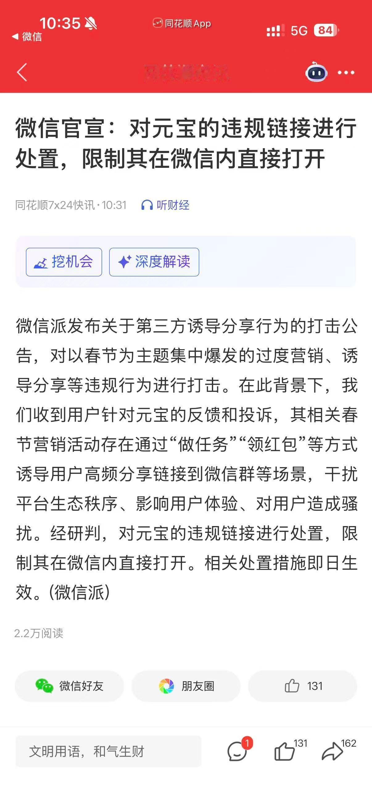 微信封杀元宝诱导链接活动,自己干自己?是不是干得晚了点,还是红包发完了。