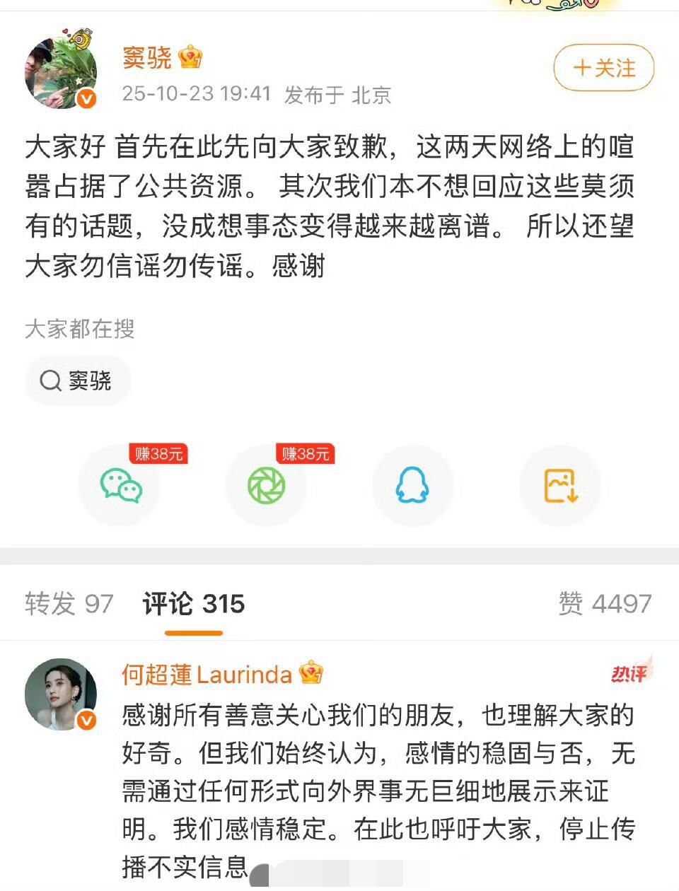 窦骁何超莲两人回应婚变传闻 既然当事人都表示“感情稳定”,吃瓜群众应该不再有质疑