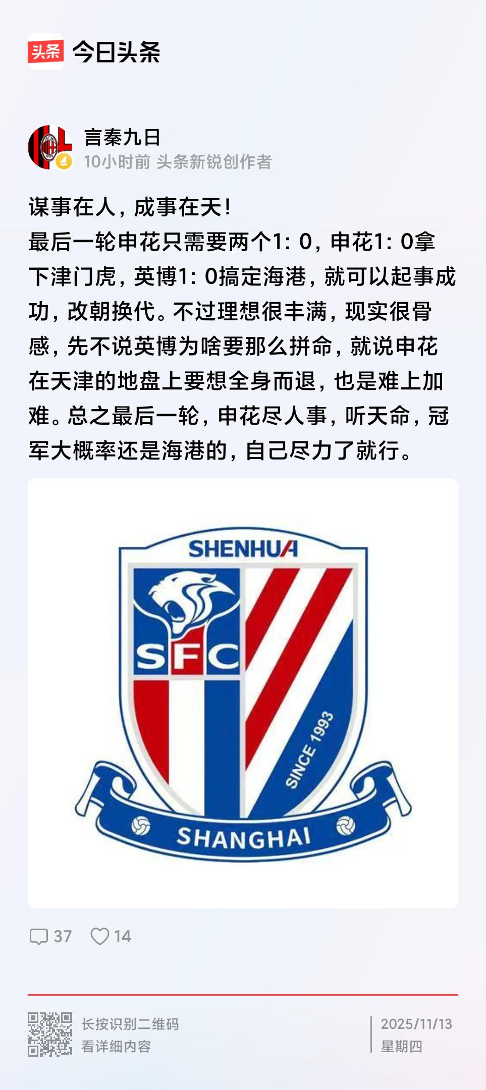 明天中超最后一轮,申花能逆袭夺冠吗? 还是一句话,做好自己,一切静等上帝安排。