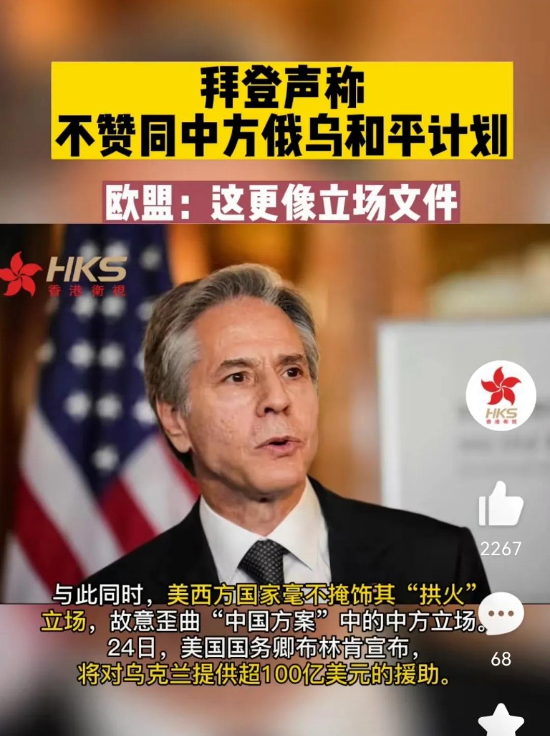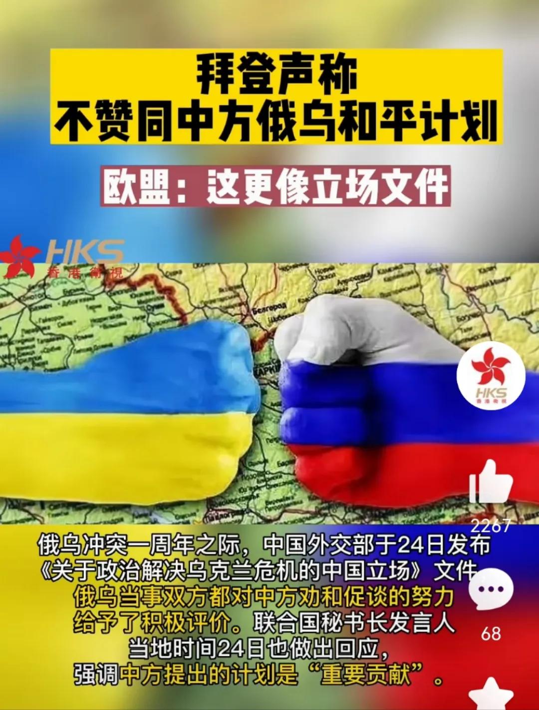 拜登不赞同中方俄乌和平计划,称只对俄罗斯有利。在俄乌冲突一周年之际,中国外交部在24日发表了《关于政治解决乌克兰危机的中国立场》文件。在这份文件发表后俄乌双方对中国的建设性意见给出了积极评价。联合国发言人高度赞赏中方的文件是对解决俄乌冲突的“重要贡献。”然而对中国的建议欧洲和美国却并没有表示赞同。欧洲外事部发言人说:中国方案没有考虑到侵略者和受害者在这场非法战争中所扮演的角色。“更像是一份立场文件而不是和平计划。”而美国总统拜登则称:俄方对中国方案表示赞同,但没有看到任何表明该方案的实施会对俄罗斯以外的任何人有利的内容。他还强调“中方企图通过谈判帮助乌克兰结束冲突的想法是非理性的。”与此同时美国在24日又宣布向乌克兰提供超过100亿美元的援助,继续在乌克兰问题上拱火。
