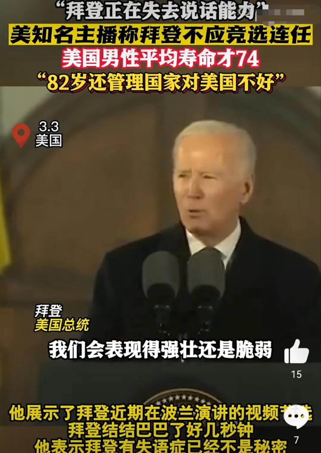 82岁的拜登竞选连任,美国这是要搞领导终身制?现代社会政治制度文明的两大最重要突破一个是废除了世袭制,一个是没有了领导终身制,这两个制度的弊端自不用多说,是阻碍人类社会进步的两大顽疾。人一般在到了70岁以后大脑已经过了最佳状态, 身体的各种机能都在快速下降,因此人类退休的年龄普遍在60-65岁之间,个别脑力工作者可以到70岁左右。然而美国的政界却是一大帮高龄老人在执政,拜登78岁当选美国总统,并且在82岁的时候还要继续竞选下一届。从拜登的角度来说,82岁了还要占着这么重要的位置,没有一点为国家考虑的念头,在拜登身上看到的只有自私和贪权。从国家角度来说3亿多的美国人不可能选不出一个比拜登既年轻又能力强的领导人,只能说美国所谓的民主制度有很大问题。站在权利中心的始终是那一小撮人,本质上就是披着民主外衣的小集团专制,如今又快多了一个领导终身制。