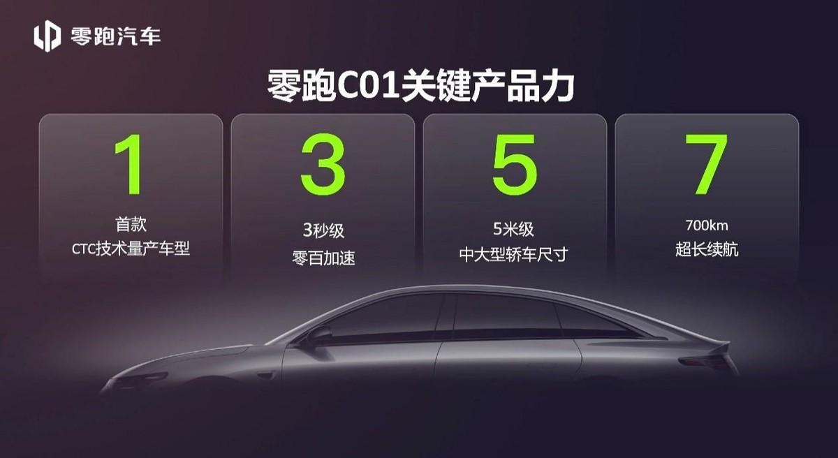 你是不是跟我一样在选车时会纠结买轿车还是SUV?买SUV虽然空间大,但是操控性和个性不够突出;买轿车虽然操控好,但是空间太小,坐着憋屈,东西放不下,无法满足带孩子出行的需求。不过最近我看见汽车之家报道,零跑将推出一款车身长度达到5米级的轿车,后排大沙发乘坐舒适,后备箱空间装的下出行装备;此外C01动力性能强,零百加速达到3s级,而且综合工况续航里程更是超过了700公里,这款零跑C01着实吸引了我的眼球。 空间表现突出,零跑C01车长远远超越比亚迪汉EV和小鹏P7等车型,与蔚来ET7一样超过了5米,空间表现绝对惊艳,不过它的优点还不止这些。 C01是首款应用了CTC电池一体化技术的车型,同时该车拥有3秒级的百公里加速成绩,与特斯拉Model 3四驱性能版和帕拉梅拉4.0T版本同属3秒俱乐部的成员,眨眼的时间车速便可从0突破100码,在红绿灯起步时真的是说走就走,毫不拖泥带水。除此之外,该款车型还配备了容量为90kWh的电池包,综合工况续航里程超过700千米,这样的续航标准早已突破了日常代步通行的范畴,可以进一步扩大生活半径,充满电就可以满足周末临近城市自驾游。 零跑将C01优势亮点总结为“1357”,这样简单直白的标签也符合零跑的工科技术男风格,走务实路线,不跟你玩那些虚的。今年这款性能全面越级的车型便会上市,确实挺令人期待的。