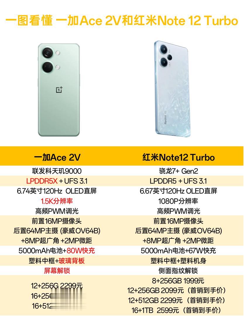 他急了他急了!昨晚的红米新机发布会上,卢伟冰接连硬刚一加,这是急了的迹象?不过还是得拿产品来说话,刚发布的红米Note 12 Trubo,感觉配置上不如一加Ace 2V啊!简单举几个例吧。 屏幕:一加是1.5K屏,红米是1080P屏; 处理器:一加是天玑9000,性能更强,红米是骁龙7+ Gen2,能耗更好; 充电:一加是80W闪充,红米是67W快充; 机身:一加是玻璃后盖,红米是塑料后盖。 最后定价方面,一加Ace 2V是2299元起(12+256GB),红米Note 12 Trubo的12+256GB版本定价是2099元,差价在200块,但一加的配置明显更据诚意啊,大家会怎么选呢?
