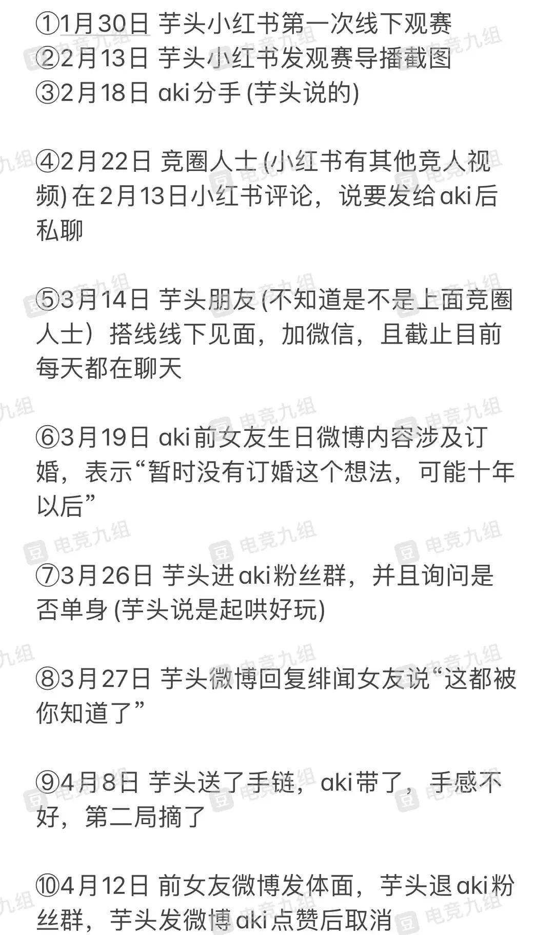 半夜上厕所 刷Aki小号发的一条的信息,点开评论就有什么小楼被劈腿了,无缝衔接什么的,这些评论激活了我八卦羁绊,不挖睡不着,然后就马不停蹄的去挖八卦,看了部分爆料,基本确定Aki和小楼有高度重合点(图二) 芋头疑似Aki近期的女朋友,据说她是OMG的粉丝还是个富婆,线下观赛被导播截图然后经朋友认识Aki,看(图三)时间轴。 Aki的瓜应该没有多大的狗血,没拉扯,唯一感兴趣的就是小楼了,好兄弟居然偷偷谈恋爱了。
