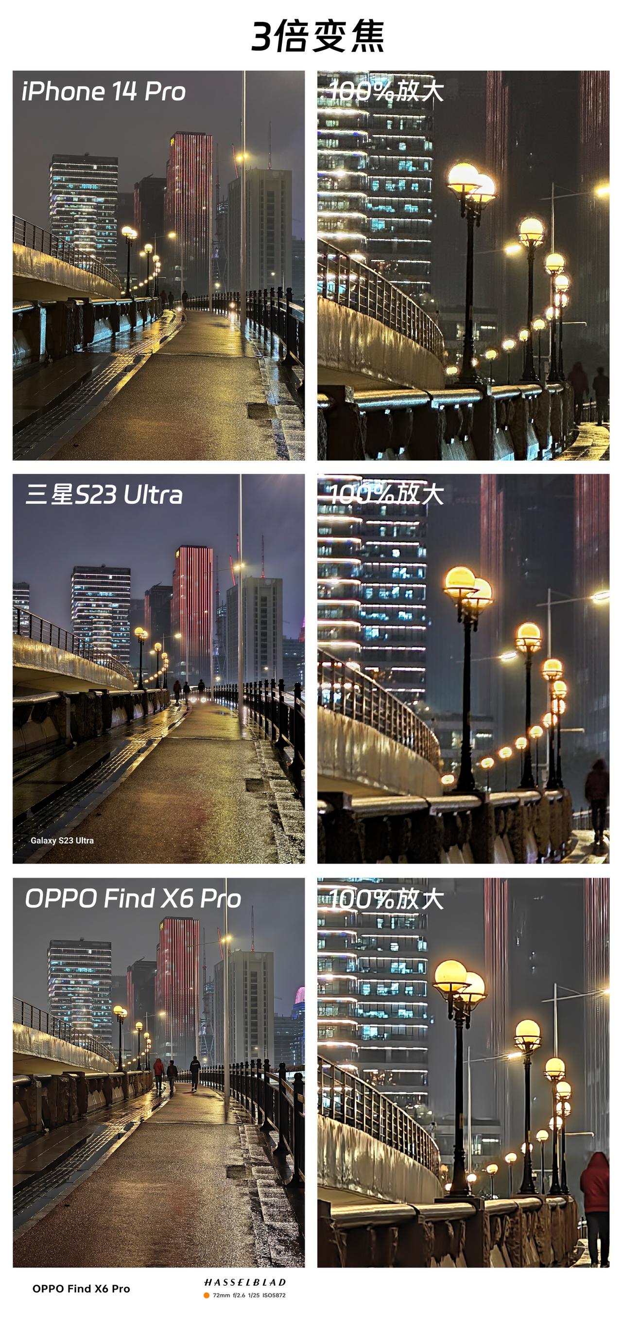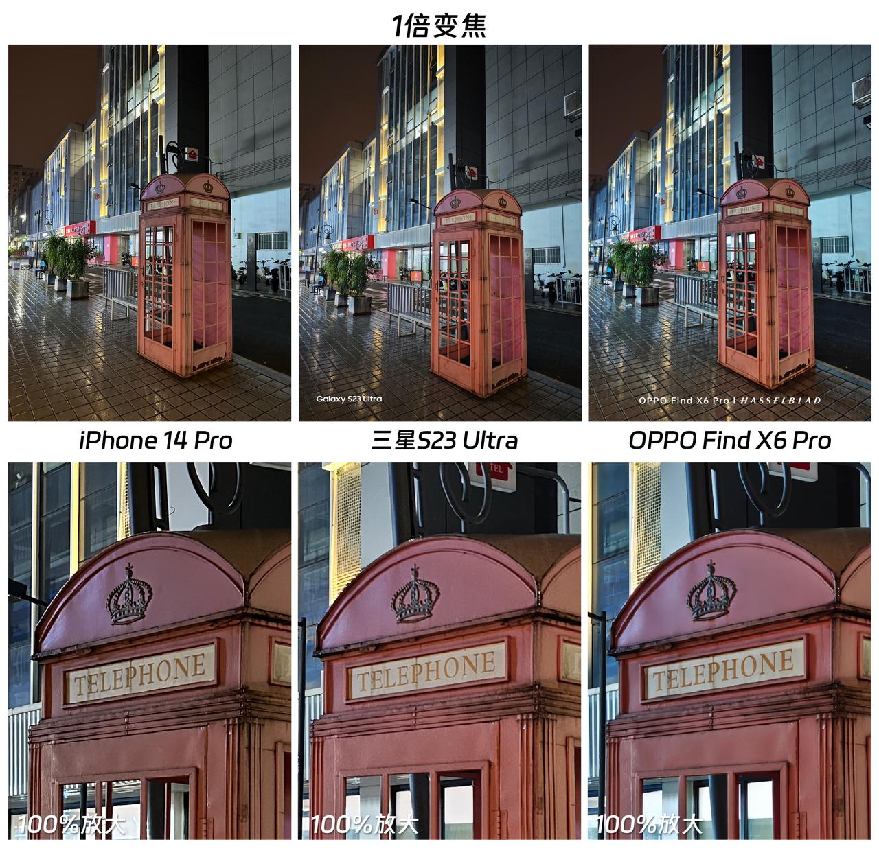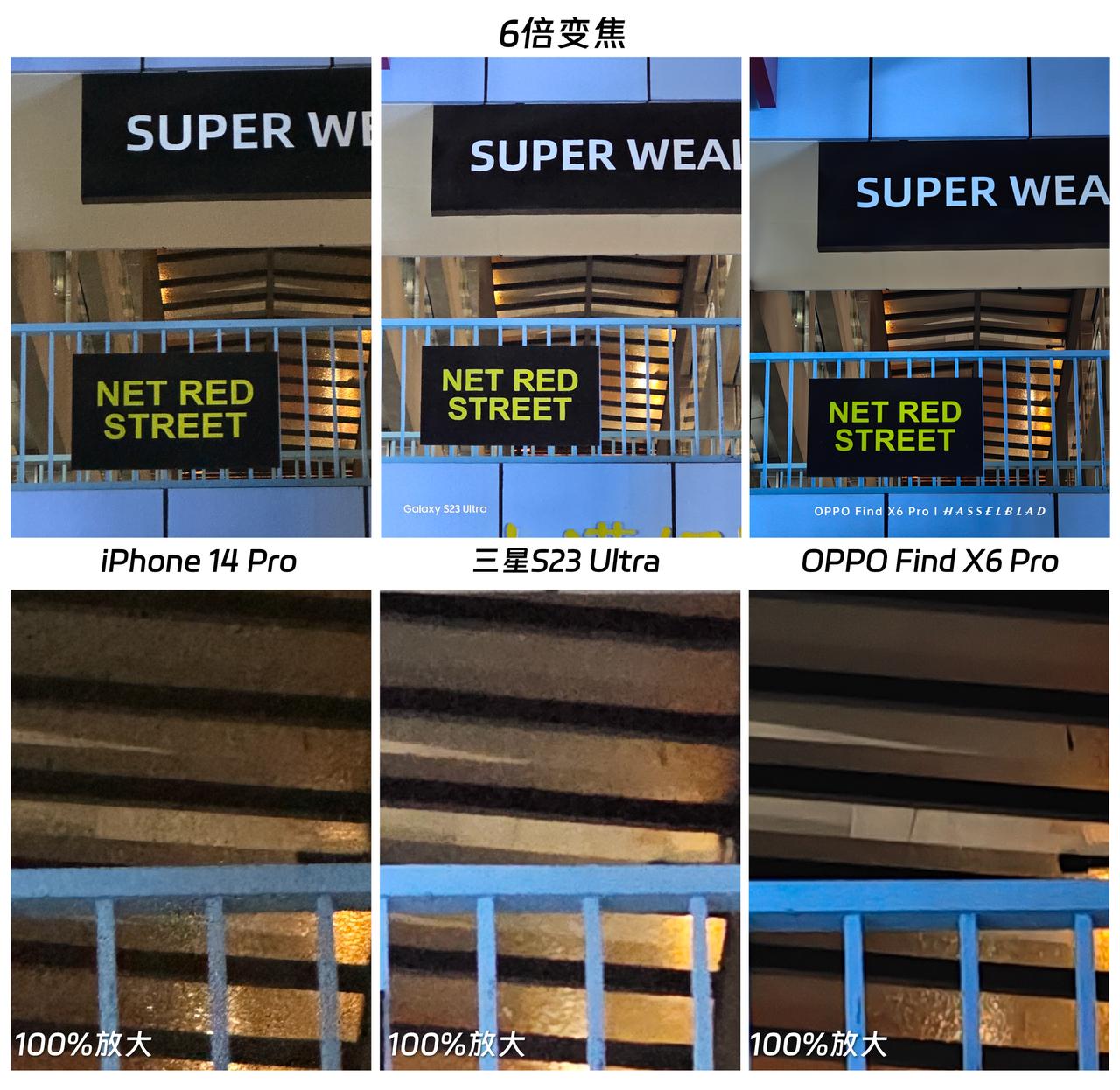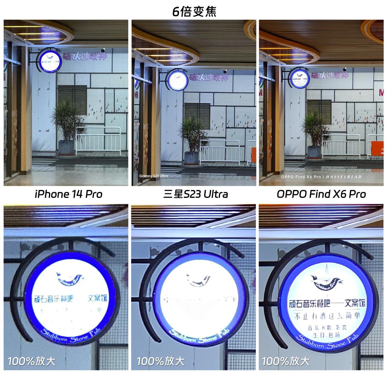 开卖一个多月时间后,OPPO Find X6 Pro的影像优化得怎样了?对比三星、苹果的顶级旗舰,告诉大家真实对比效果。 首先在1X变焦的模式下,这三款旗舰手机的表现都很不错,即使放大100%也能看到细节保留还是挺丰富的,几乎拉不开什么差距,只是色彩风格不尽相同而已。不过到了3X、6X变焦模式下,Find X6 Pro 的优势就明显起来了,先看图4,能感觉到iPhone的样张出现了一点高光溢出的情况,三星、OPPO的综合表现亮眼一些。 而在6X变焦(图5、6)模式下,Find X6 Pro的整体表现不错,比如高光压制更到位,灯牌上的字仍能清晰所见。而且相对来说,Find X6 Pro拍出来的画面噪点更少,显得更纯净一些,那么,大家觉得这三款旗舰手机,哪款手机拍出来的样张更好呢?