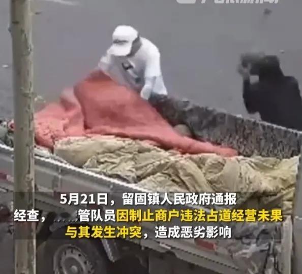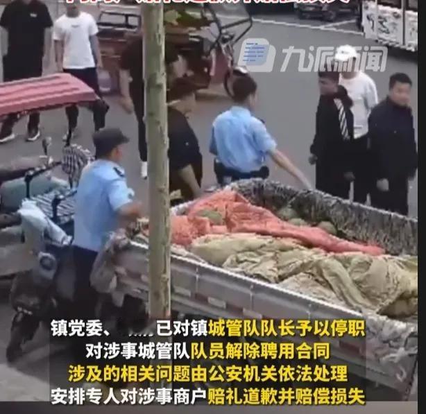 近日,河南刘固镇城管因为制止水果商户违法占道经营无果,暴力执法将商贩的西瓜砸烂。这是怎么回事呢? 视频中几个疑似城管执法人员的男子将水果商贩的西瓜抱走。此外,一名身穿黑色衣服的男子和一名身穿白色衣服的男子将西瓜从车内抱出,怒砸西瓜。看着这股狠劲儿,一服不听话,立马让你好看的嚣张气势,紧接着,道上三个身穿黑衣服的城管气势汹汹的走来,想要加入砸瓜的队伍。这个时候,西瓜商贩情急之下提着菜刀指着暴力执法的城管与他们对峙,可城管依旧是我行我素,拿着西瓜就猛砸。这个时候,两名身穿制服的民警发现冲突,立刻挺身而出,指着城管让他们停止砸瓜。 随后,民警用手铐铐住了黑衣男子和白衣男子,并将涉事人员全部带。5月21号晚上,刘固镇人民政府发布通报称,已对镇城管队队长予以停职,对涉事城管队队员解除聘用合同,涉及的相关问题由公安机关依法处理,同时安排专人对涉事商户赔礼道歉并赔偿损失。你对此事有何看法,欢迎评论区留言民生新闻 新闻
