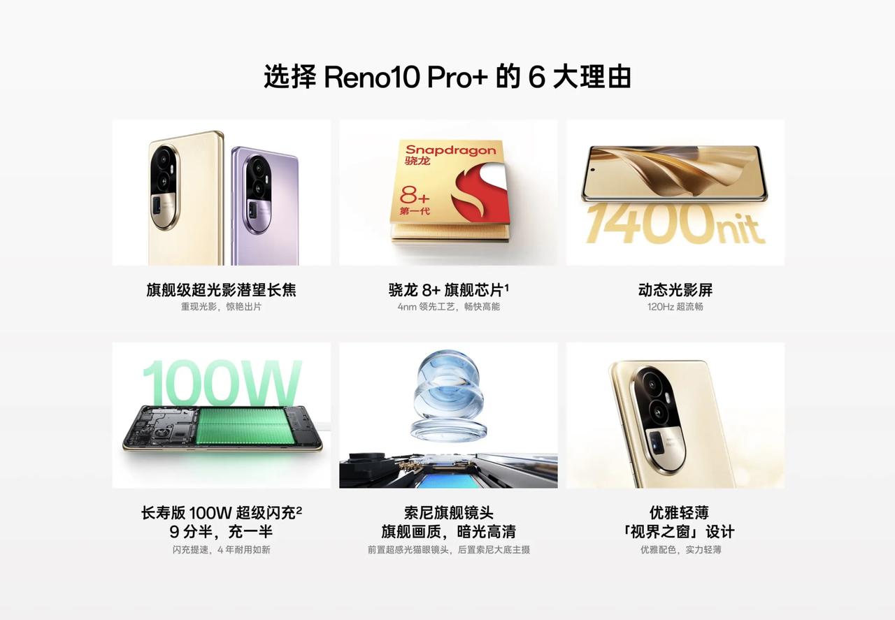 4K以内预算就能买到搭载潜望长焦镜头的手机,简直不要太香!刚看了OPPO Reno10系列发布会,这次的超大杯机型深得我心,配置很全面、水桶的同时,机身也足够轻薄,是我想要的「轻旗舰」了。 先来过一遍OPPO Reno10 Pro+的硬件参数吧! -骁龙8+处理器 -1.5K屏幕(最高亮度1400nit) -50MP主摄+8MP超广角+64MP超光影潜望长焦 -32MP前置镜头 -100W闪充 -4700mAh电池 但从硬件就能看出,这次OPPO Reno10 Pro+挺硬核的,尤其是影像方面。看了发布会介绍,这颗超光影潜望长焦支持3X、6X高品质的变焦,这应该是同价位的独一档了吧?用来拍人像、拍特写都挺合适的,加上OPPO的超光影图像引擎,感觉会是一款拍人像利器。 挺让我惊喜还有一点,就是重量、厚度了。按理说,Reno10 Pro+塞下了这么多硬核配置,重量肯定轻不了,但看了下发布会才知道,它重量才194g,厚度也不过是8.28mm,放到现在来说妥妥的轻薄手机。 最后是价格方面,Reno10 Pro+延续了OPPO的优良传统:加量不加价,这次甚至还降价了,到手价3899元起,你就说还要啥自行车吧!