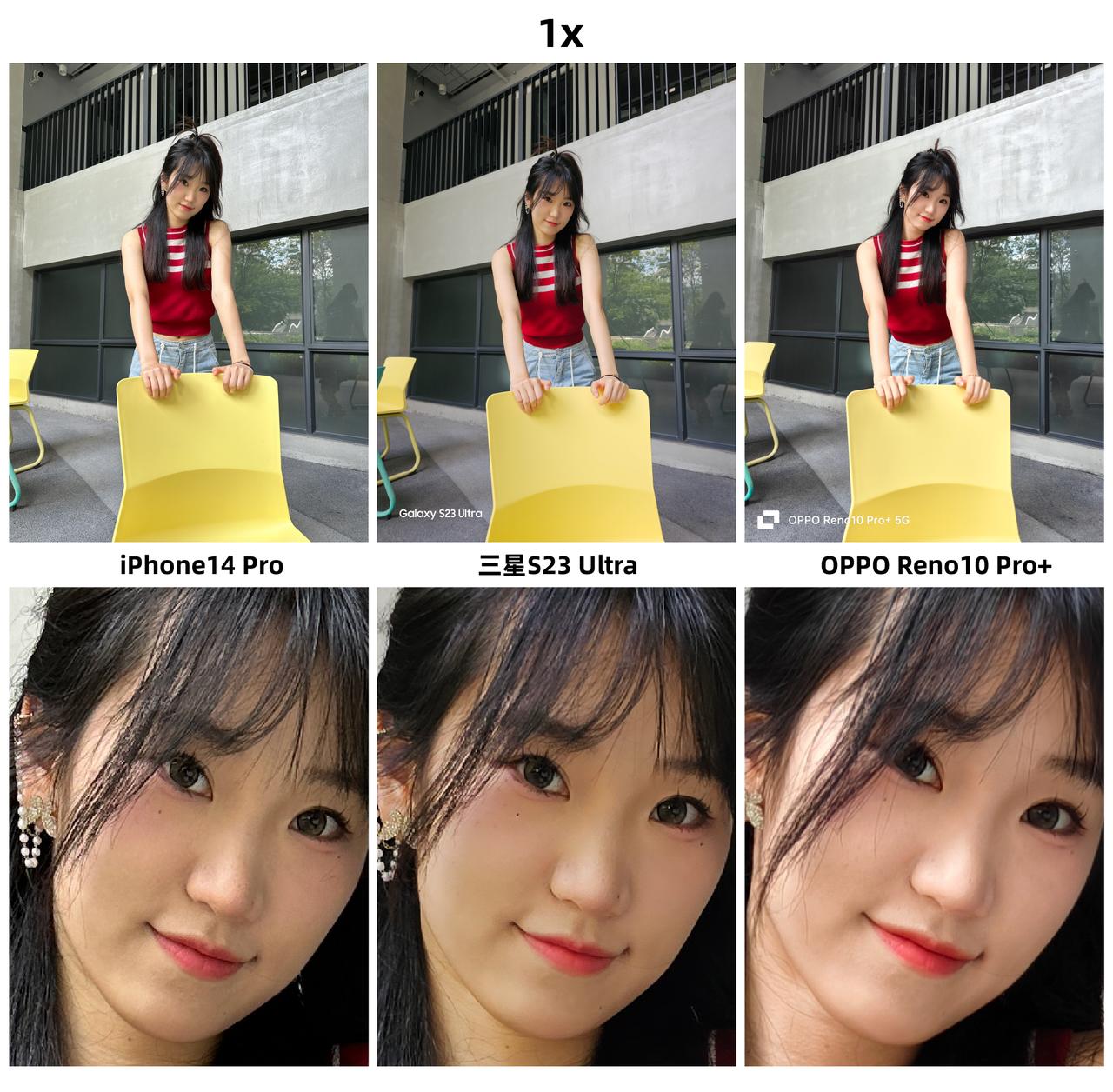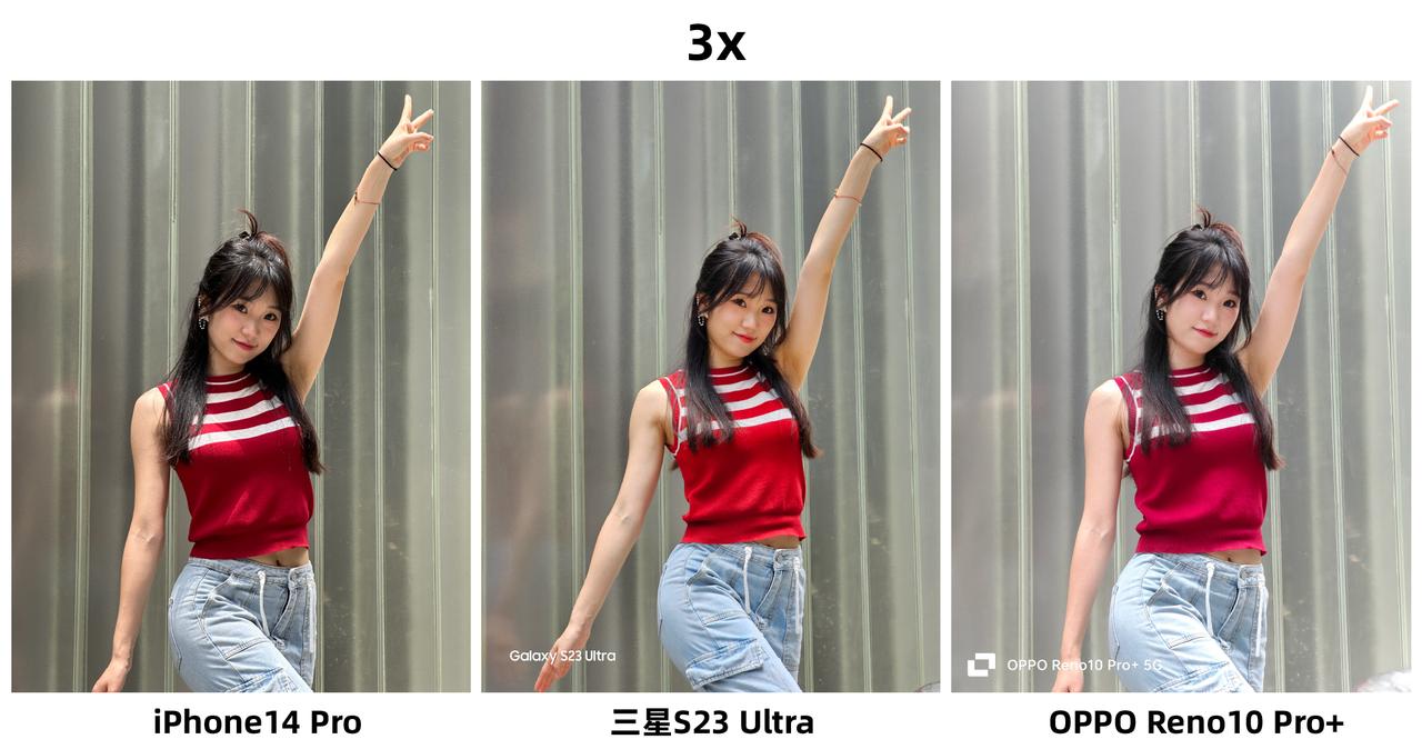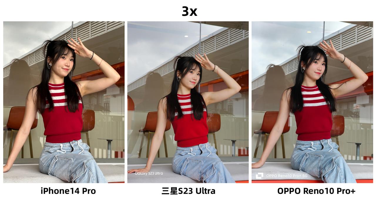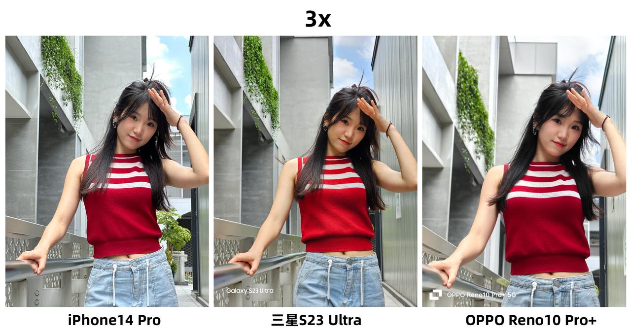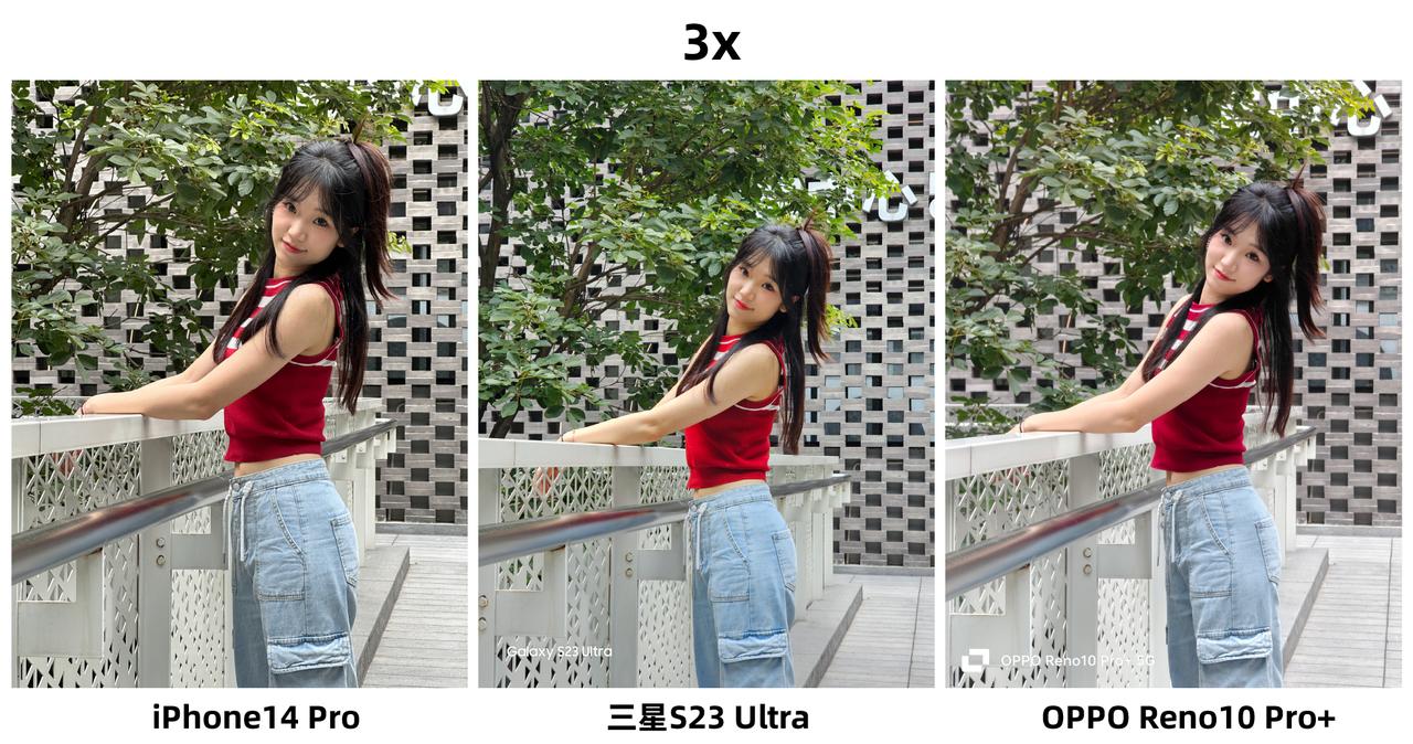 iPhone拍人像终于不再是“祖传”的偏黄了?刚看到有网友分享了iPhone 14 Pro、三星S23 Ultra和OPPO Reno10 Pro+三款手机拍的人像样张对比,感觉果子这次的表现挺好的,怀疑用的是假苹果(手动狗头)~ 在1X焦段模式下,我感觉OPPO、三星的表现更好,尤其是第一张逆光环境下,OPPO、三星拍出来的人像照看起来更自然,相对来说iPhone的背景就严重过曝了,背景天空处的细节几乎没有。图2、图3放大100%看细节的话,我觉感觉是OPPO、三星更好,小姐姐妆容的纹理看起来更自然,而iPhone主打的就是一个真实,估计这并不是小姐姐们想要的效果吧? 然后是在3X焦段下,很考验这三款手机的长焦能力。在这一环节我感觉iPhone支棱起来了,没有出现以往偏黄的情况,整体观感好了不少,反而是三星拍出来的画面色调有所偏黄,我都一度怀疑是不是搞错了样张?不过要说人像拍得最好看的,我觉得还得是OPPO Reno10 Pro+,肤色更加白皙,而且美颜恰到好处,看起来也自然,估计这才是小姐姐们喜欢的拍照效果吧?