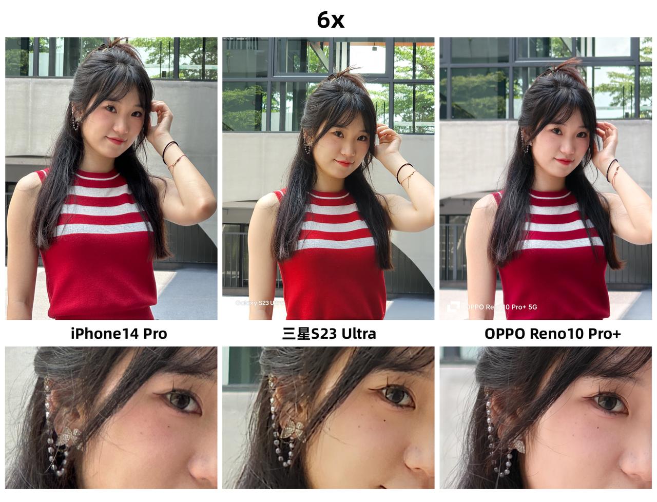 估计摄影老司机都知道,50mm、85mm这两个焦距用来拍人像是最适合的,也被誉为拍人像的“黄金焦距”,换算过来的话,大概相当于手机端的2X、3X焦段。目前最近的OPPO Reno10系列把长焦镜头打到2.5K-3K价位段,全系标配长焦人像镜头,实际效果怎么样?跟苹果三星旗舰比比看。 最近就有网友用OPPO Reno10 Pro+、iPhone 14 Pro和三星S23 Ultra进行了人像样张对比。在3X焦段模式下跟果子和三星比拼的,大家可以看图1的细节放大对比图,Reno10 Pro+对于肤色美颜的效果自然,看起来更有气色一些,而相对来看的话,果子、三星的风格,女生拍完照可能还得去稍微P下图。 整体来看的话,我认为Reno10 Pro+很懂拍人像,拍出来的人像照显得肤色更加白皙,而且美颜效果恰到好处,并不会是很突兀的感觉,反而看起来很精致,头发丝细节也能兼顾到,属于那种拍完就能发朋友圈、小红书的程度,完全不需要后期再进行修图了。就人像拍照效果来看,这三款手机中,大家喜欢哪款手机拍出来的效果呢?