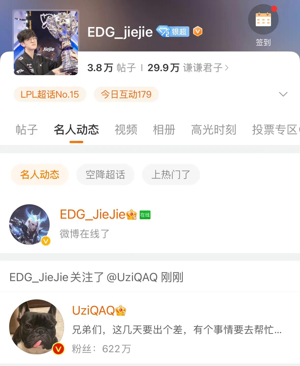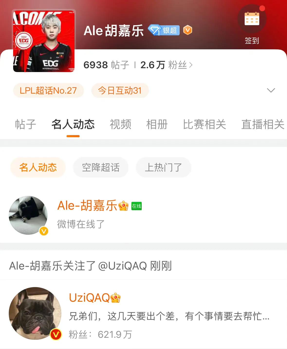 继EDG老板爱德朱关注UZI后,EDG俱乐部也关注了UZI,Ale、Jiejie