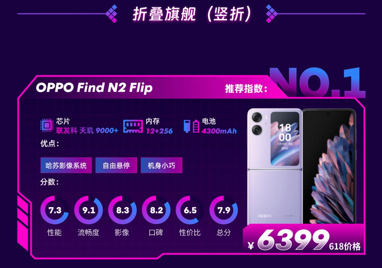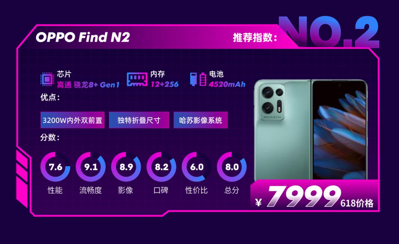 鲁大师最近发布的这份“618手机闭眼买”榜单有点意思,根据综合性能、流畅度、影响、口碑以及性价比五个维度,去筛选出值得闭眼买的手机,感觉挺值得参考的。 其中在竖向折叠屏手机领域中,鲁大师最推荐的机型是OPPO Find N2 Flip,给出了总分7.9的高分。作为一款竖向折叠屏手机,Find N2 Flip开创了大尺寸外屏的先例,而且在APP适配方面很积极,如今已能实现在外屏上回微信、看抖音、刷头条等功能了,体验更舒适,而且Find N2 Flip的续航也没有落下,4300mAh的电池,轻度使用的话也能保障一天的续航表现。 而在横向折叠屏手机中,OPPO Find N2也成为了鲁大师推荐的机型之一,恰到好处的机身尺寸,提供了更好的手感,而且还有哈苏影像系统加持,拍照等方面都很能打。如果打算在618买折叠屏手机的话,这两款值得一看。
