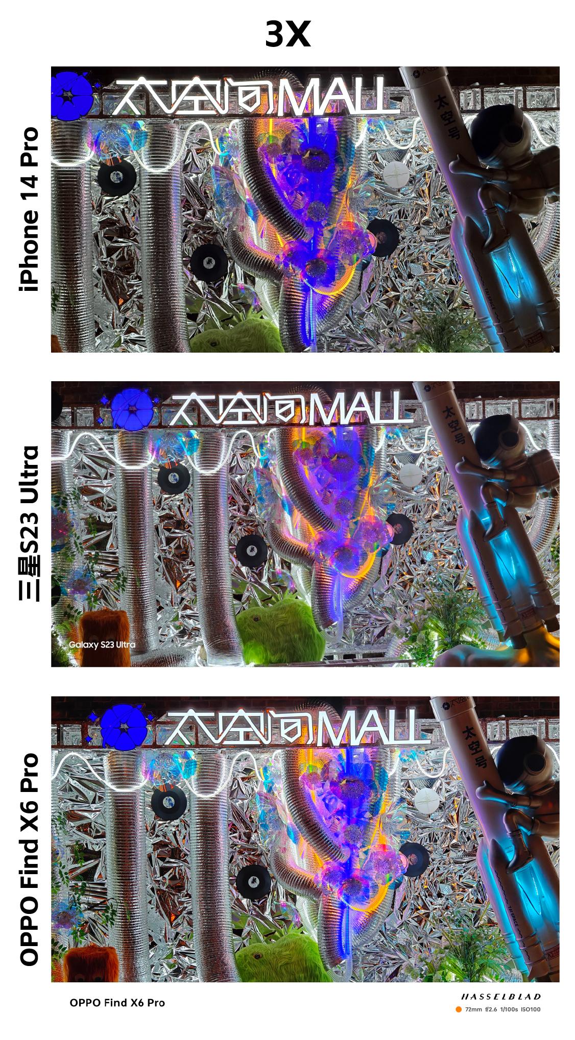 感觉苹果、三星越来越懂国内消费者了,618这个降价力度确实可以!iPhone 14 Pro的起售价来到了6K+,三星S23 Ultra的起售价也来到了7K+,确实是个难得的入手时机。但如果平时喜欢用长焦拍照的话,我觉得国产旗舰也会是个不错的选择,比如OPPO Find X6 Pro这款~ 最近就看到有网友分享了苹果、三星和OPPO这款旗舰的长焦实拍对比图,在夜晚光线相对较弱的地方,感觉Find X6 Pro这颗大底长焦镜头还是挺有优势的,拍出来的画面更清晰不说,而且画面细节也要丰富许多,噪点、高光也控制得很好。如果平时用长焦镜头拍照比较多的话,Find X6 Pro值得考虑下~