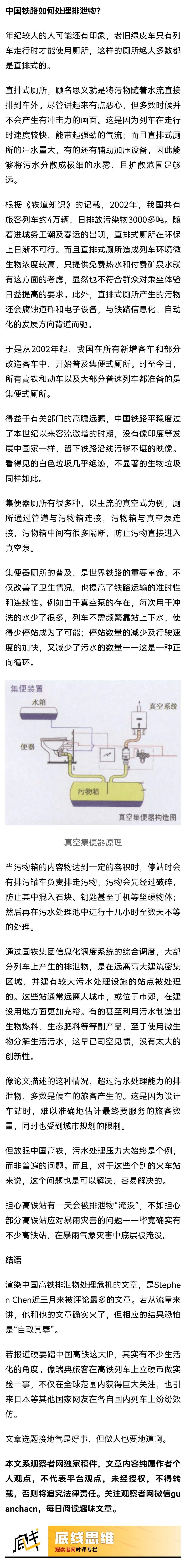 就是这样一篇立意不高、内容单薄的“标题党”文章,却意外引发了大量关注。有人添油加醋:“外媒暗访中国高铁后惊呼,高铁已被粪便淹没?再不处理后果严重”。也有很多科普自媒体认真介绍了中国高铁如何处理排泄物,并理性地认为“不必过于担心”。