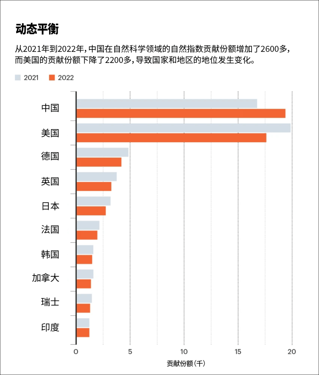 在榜单前十位中,排在中国之后的国家分别是美国、德国、英国、日本、法国、韩国、加拿大、瑞士和印度。在同一时期,美国在自然指数中的调整份额则下降了7%,至17610.49分,英国和德国也都下降了约9%。