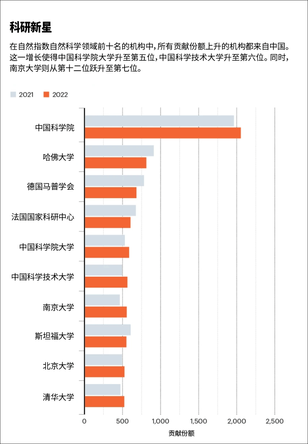 在2022年自然科学论文份额最高的20个机构中,有一半都在中国,且这些中国机构从2021年到2022年的贡献份额都有所增加。另一边,前二十榜单中的其他非中国机构的份额都有所下降。唯一接近扭转这一趋势的机构是英国剑桥大学,其份额仅下降了0.1%。