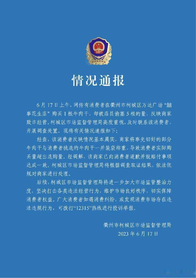 【#买1根牛肉干被偷塞5根称重#?官方:将依法依规对商家进行处理】#官方通报买1根牛肉干被偷塞5根称重#据“柯城发布”微博发布情况通报,6月17日上午,网传有消费者在衢州市柯城区万达广场“囍事花生店”购买1根牛肉干,却被店员偷塞5根的量,反映商家欺诈经营。柯城区市场监督管理局高度重视,及时联系该消费者,开展调查处置。现将有关情况通报如下: