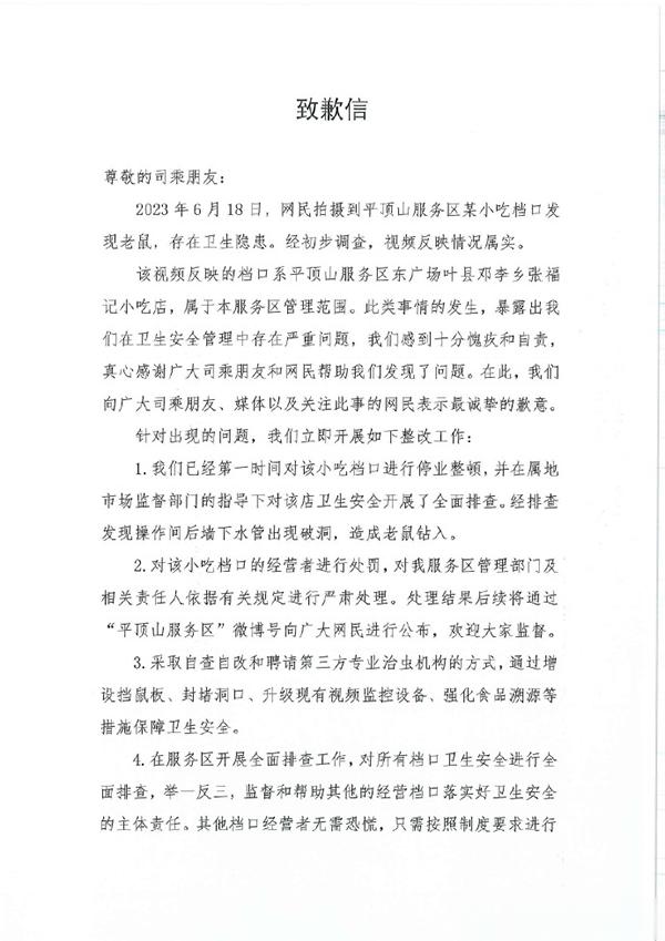 6月19日,河南平顶山服务区官方账号发布该事件致歉信表示:2023年6月18日,网民拍摄到平顶山服务区某小吃档口发现老鼠,存在卫生隐患。经初步调查,视频反映情况属实。