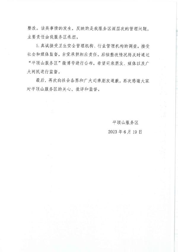 最后,再次向社会各界和广大司乘朋友道歉,再次感谢大家对平顶山服务区的关心、批评和监督。
