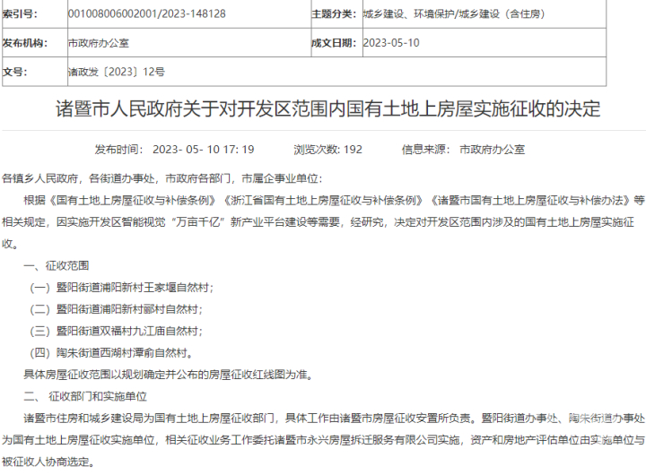 橙柿互动记者了解到,今年5月10日,为了实施开发区智能视觉“万亩千亿”新产业平台建设等需要,诸暨市人民政府对外发布了关于对开发区范围内国有土地上房屋实施征收的决定,其中就包括浦阳新村王家堰自然村。