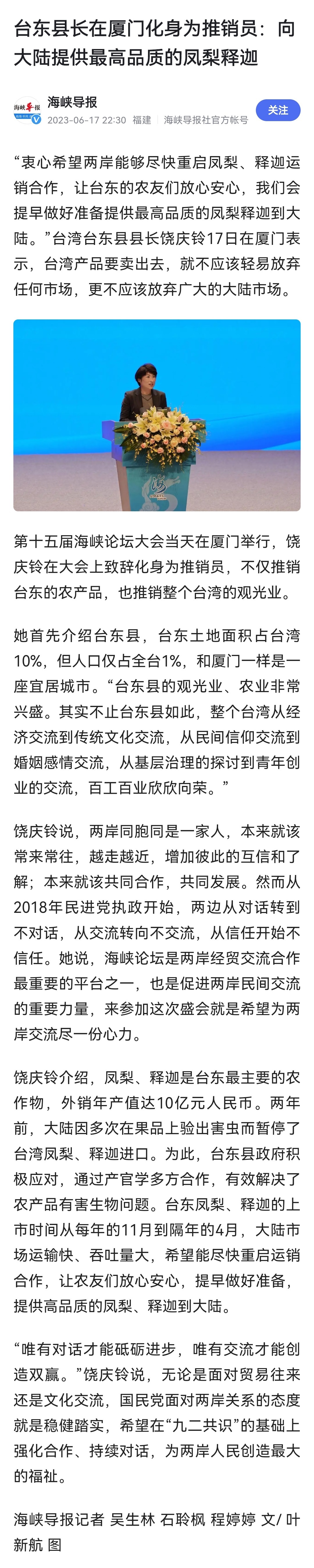 6月17日,台东县长饶庆铃在海峡论坛上表态,向大陆提供最高品质的凤梨释迦