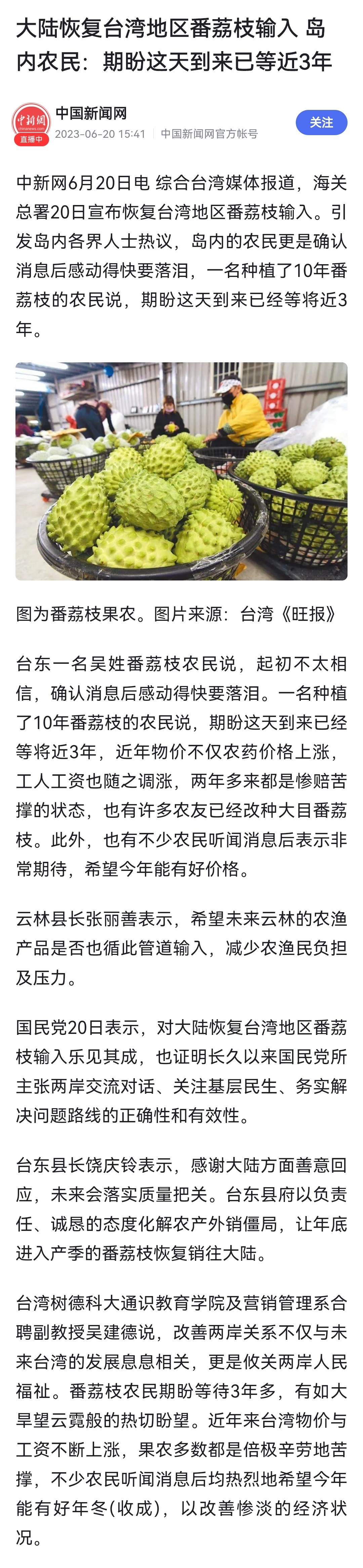 6月20日,海关总署宣布恢复台湾地区番荔枝(释迦)输入,岛内农民听闻消息后感动得快要落泪[doge]