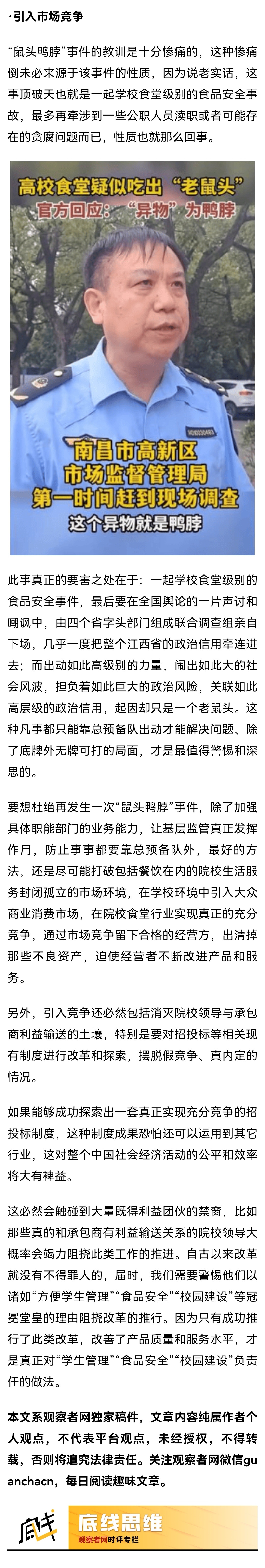 【“鼠头鸭脖”只是个例,学校食堂还有个更普遍的问题】托卡马克之冠:要想杜绝再发生一次“鼠头鸭脖”事件,除了加强具体职能部门的业务能力,让基层监管真正发挥作用,防止事事都要靠总预备队外,最好的方法,还是尽可能打破包括餐饮在内的院校生活服务封闭孤立的市场环境,在学校环境中引入大众商业消费市场,在院校食堂行业实现真正的充分竞争,通过市场竞争留下合格的经营方,出清掉那些不良资产,迫使经营者不断改进产品和服务。