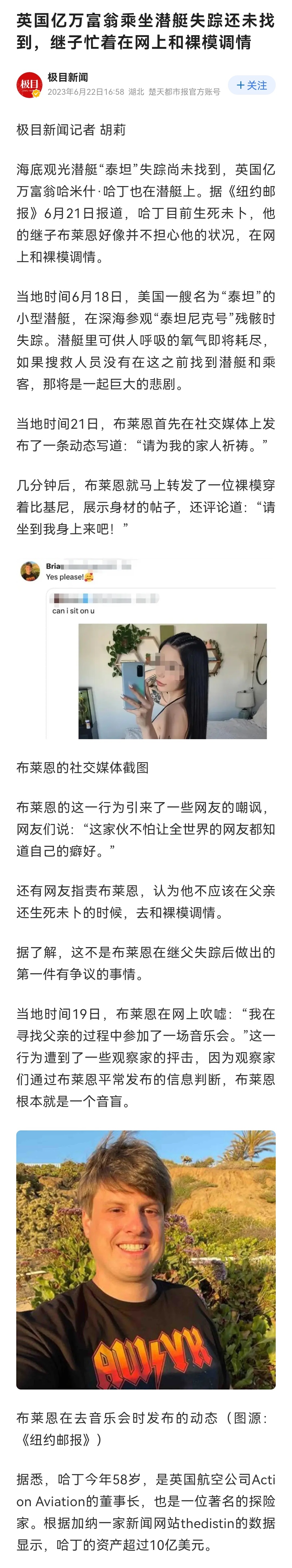 英国亿万富翁乘坐潜艇失踪还未找到,继子忙着在网上和裸模调情[喵喵][doge]