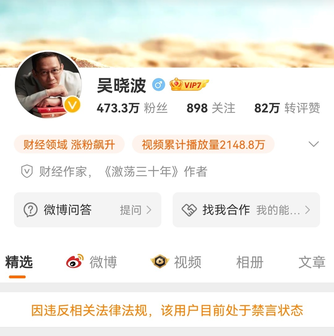 【#吴晓波微博被禁言#】#学者吴晓波微博被禁言# 6月26日,微博站方发布“本周安全小贴士”,大V用户等,通过炒作失业率、散布抹黑证券市场发展等负面有害信息,发布攻击否定现行政策和管理制度的内容,因违反相关法律法规受到禁言处置。