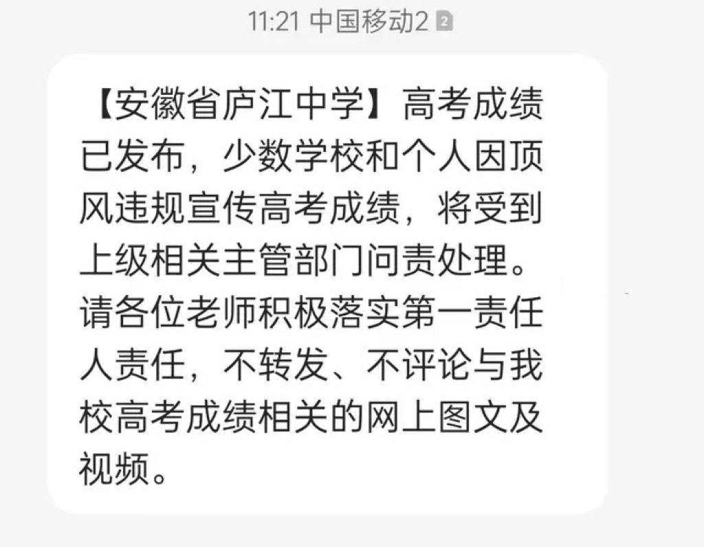 同日,一知情人向记者发布截图称,高考成绩公布后,校方为保护学生隐私,发布一则通知:高考成绩已发布,少数学校和个人因顶风违规宣传高考成绩,将受到上级相关主管部门问责处理。请各位老师积极落实第一责任人责任,不转发、不评论与我校高考成绩相关的网上图文及视频。