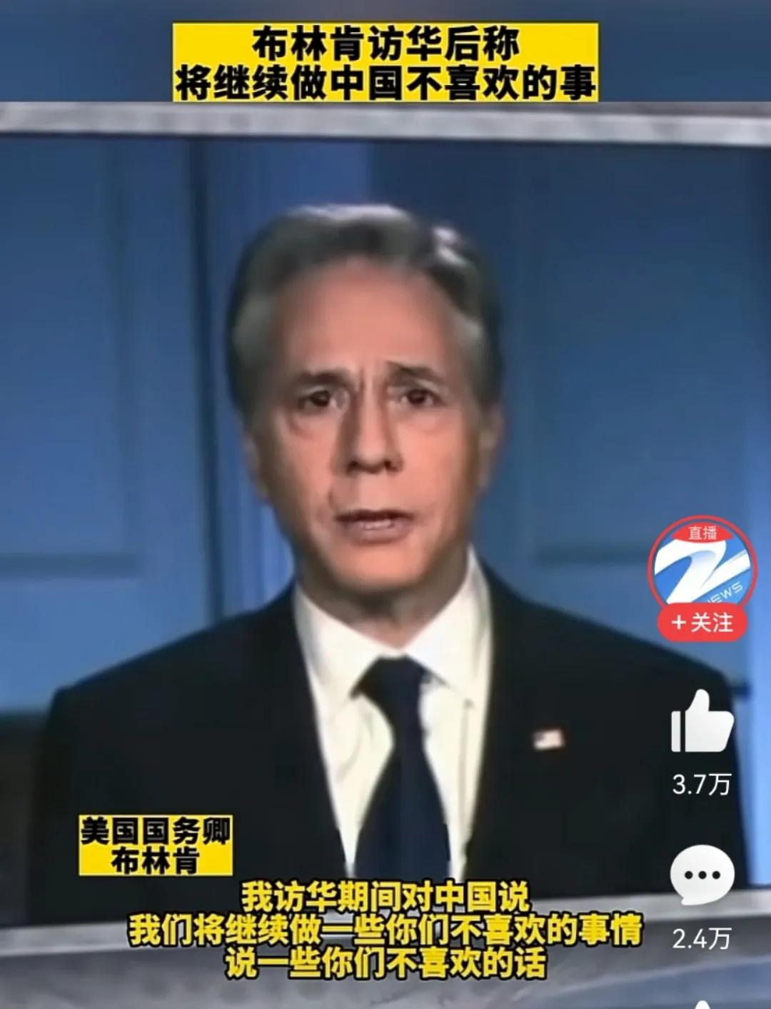 布林肯公开讲话,称他在访问中国期间明确告诉中方,美国将会继续做一些你们不喜欢的事情,同时继续说一些你们不喜欢听的话。布林肯说这番话是想证明自己对中国的出访并没有任何妥协以及出卖美国的利益,相反,美国依然向中方展现出了足够的强硬,并且在关乎美国核心利益方面绝对不会退让。
