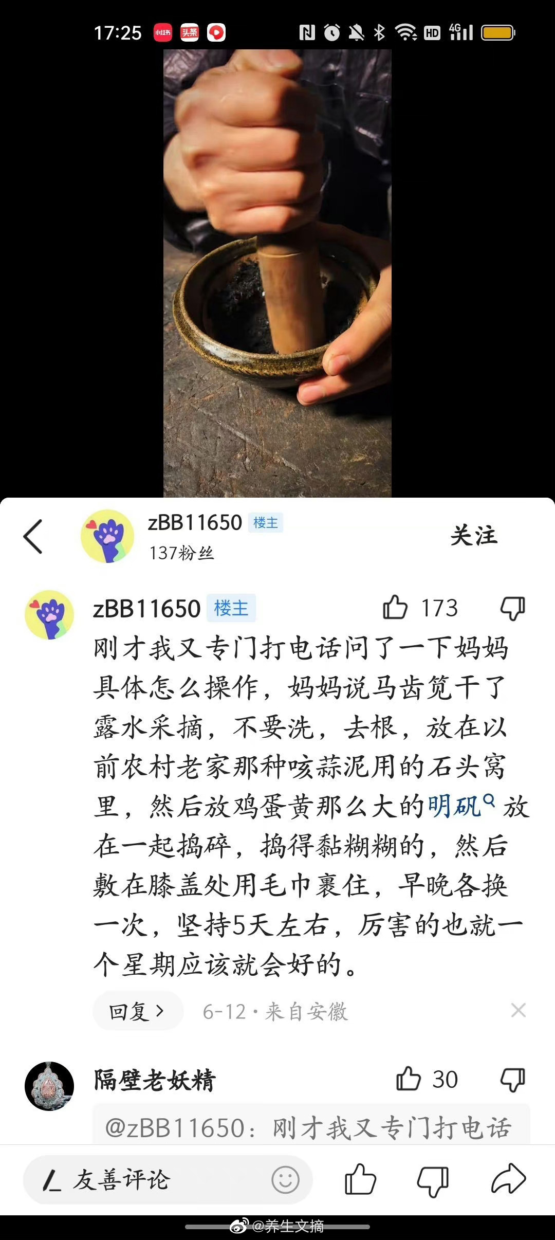 其实民间的老方子真的挺管用,小时候妈膝盖积水,在医院住院,每天早上抽积水,在医院看了好长时间也没见好,后来一个老中医传了一个方子,用农村地里到处都是的马子菜配上明矾磕碎了敷在膝盖上12小时换一次,连续几次就好了,也不用打针也不用吃药,真的很神奇,后来我妈在菜场遇到一个膝盖积水的老奶奶,我妈就把这个方子给她说了,这个老奶奶后面也神奇的好了。