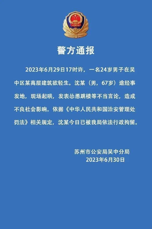 沈某言行传到网上后,引发轩然大波,网友们纷纷谴责。随着舆论发酵,当地警方打电话通知沈某家属,让他尽快自首。6月30日,沈某到派出所做笔录。30日晚间,当地警方发布警情通报,沈某被行拘。他于7月1日当天被转送到苏州市拘留所,拘留时间为10天。