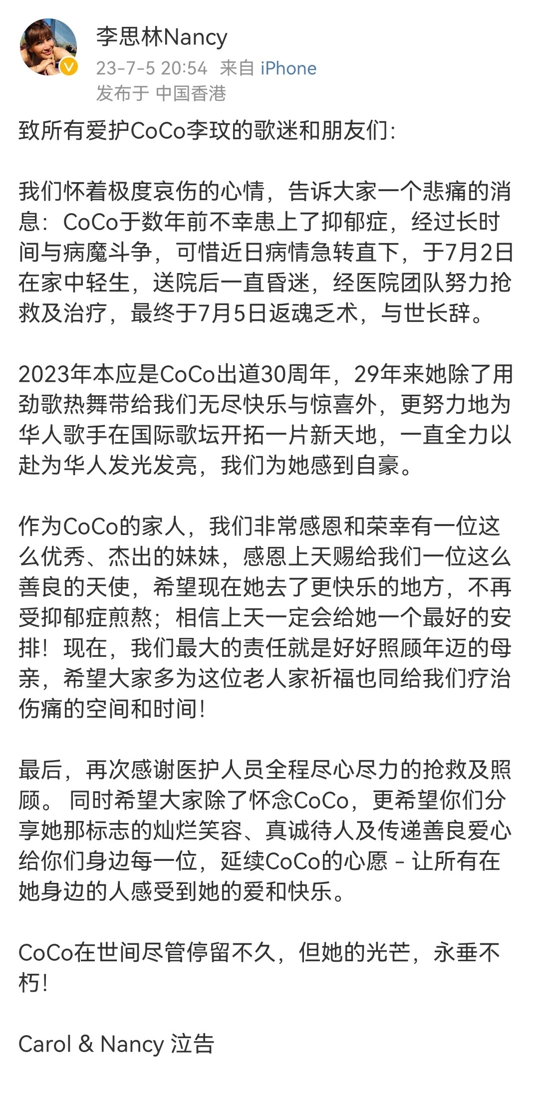 [伤心][蜡烛]#李玟去世# 7月5日晚,李玟姐姐发博,”CoCo于数年前不幸患上了抑郁症,经过长时间与病魔斗争,可惜近日病情急转直下,于7月2日在家中轻生,送院后一直昏迷,经医院团队努力抢救及治疗,最终于7月5日返魂乏术,与世长辞。“